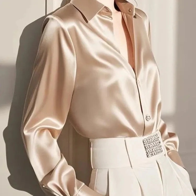 【1点ご購入 で10点プレゼントいたします】高級感気質開襟長袖サテンシャツ女春秋通勤ファッション百着トップス女