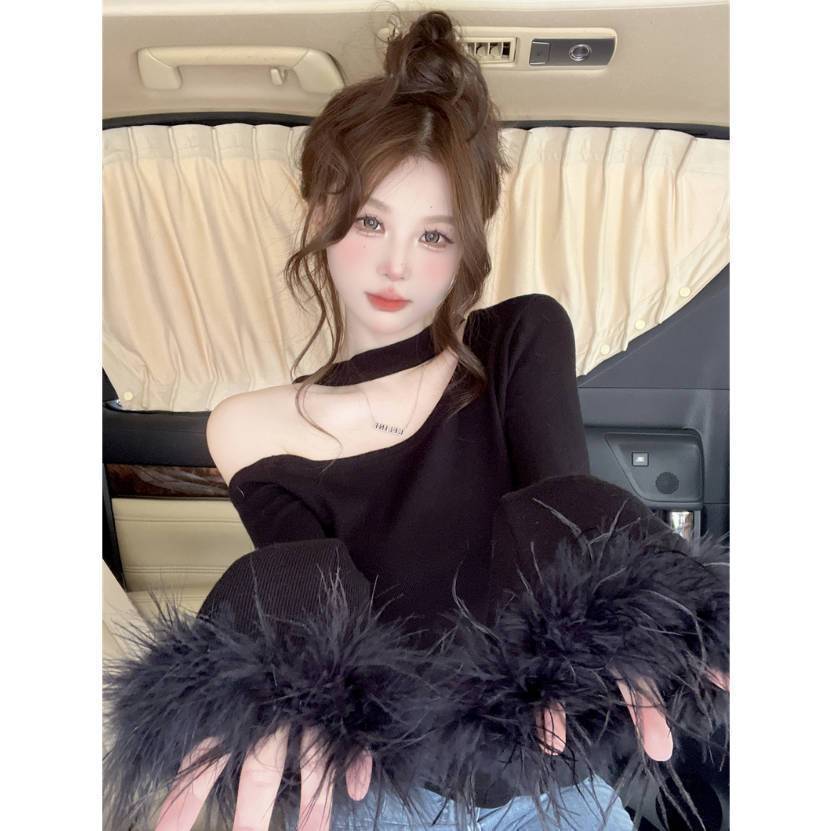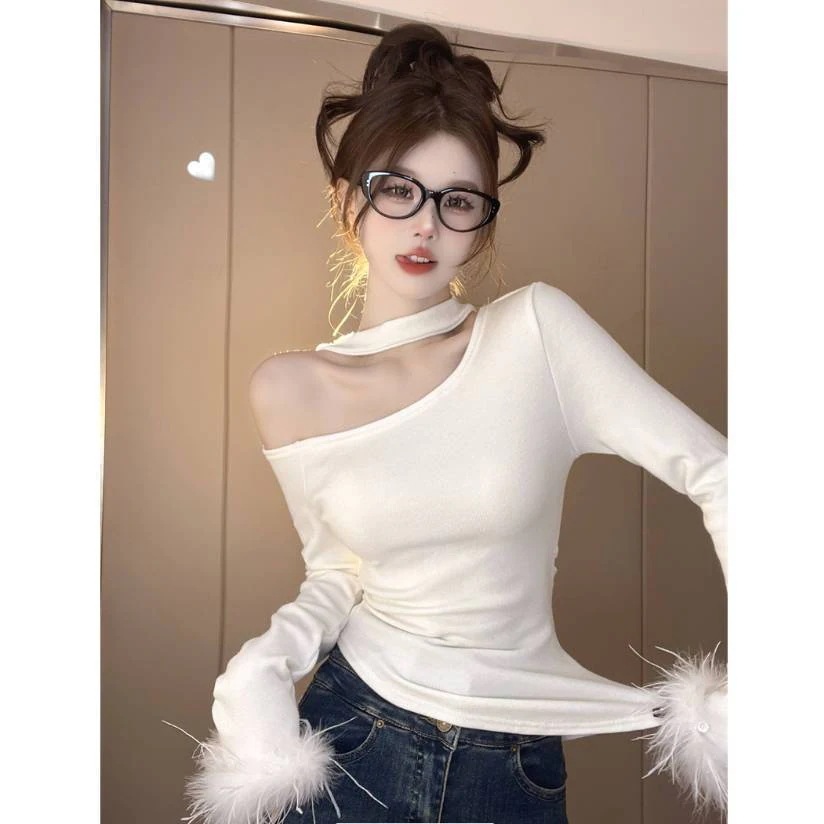 ポルカドットグレー ポルカドット オフショルダー 長袖Tシャツ春のアンダーウェア スリミングでシックなトップス