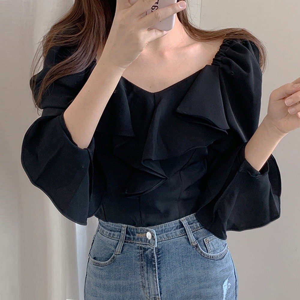 韓国ファッション 長袖ブラウス フリル襟 今っぽシアーシャツ レディースファッション