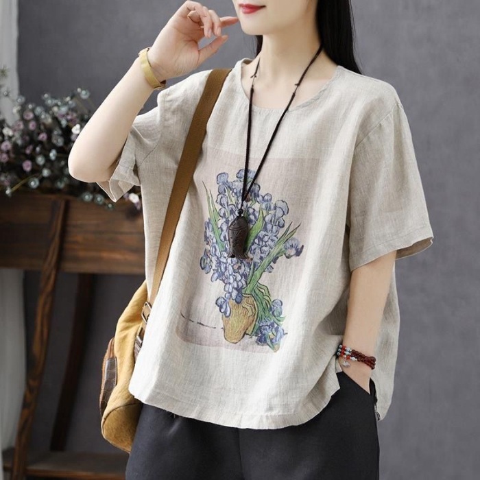 綿麻素材 ボディコンシャス Tシャツ 女性用 短袖 2025年夏新作 女性用 上着 ゆったりとしたレトロプリント 大サイズ 女性用Tシャツ トレンド感