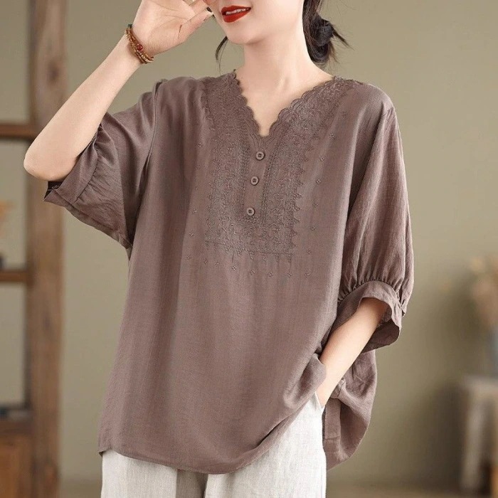 文芸系大サイズ女性用コットンTシャツ女性向け夏用ファッションレトロゆったり七分袖トップス新作ママ夏服