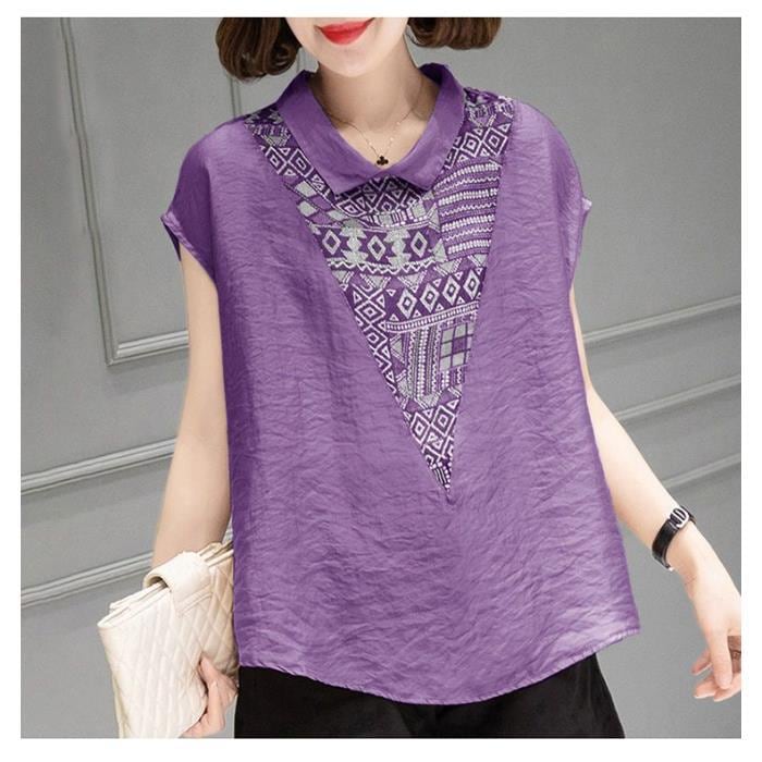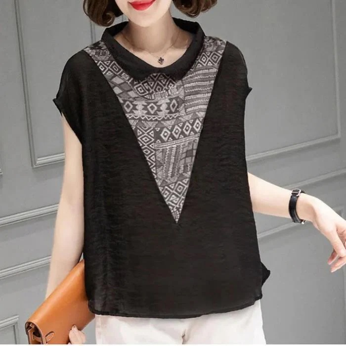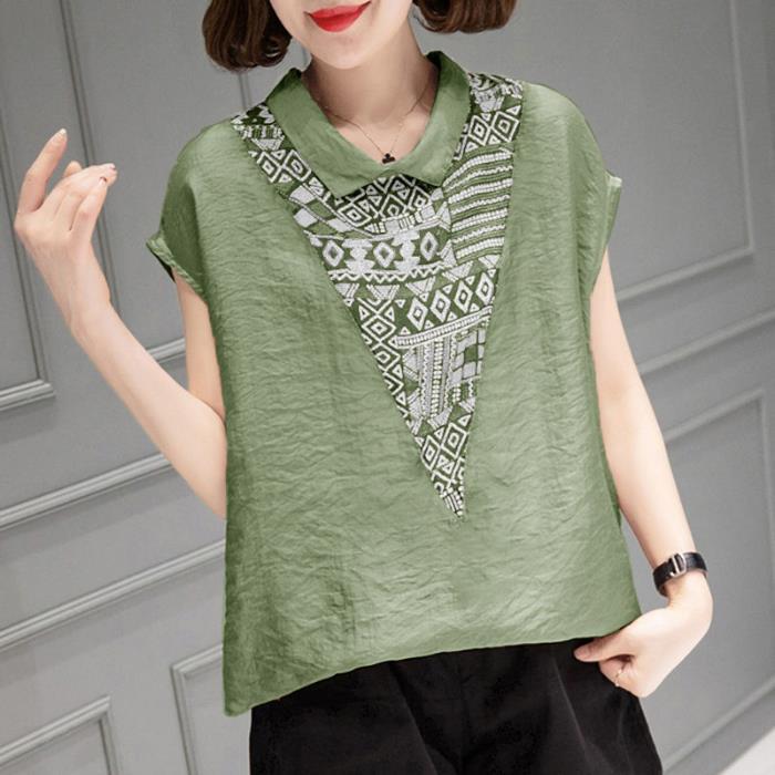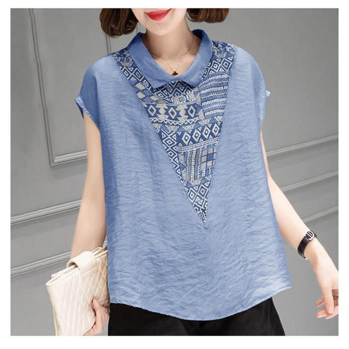 ベビーネック半袖コットン麻シャツ 夏用ゆったりスリム プリント柄 大サイズ女性用シャツ 腹部カバー シャツ