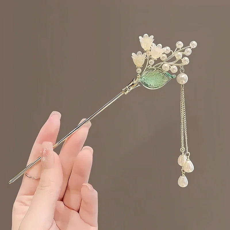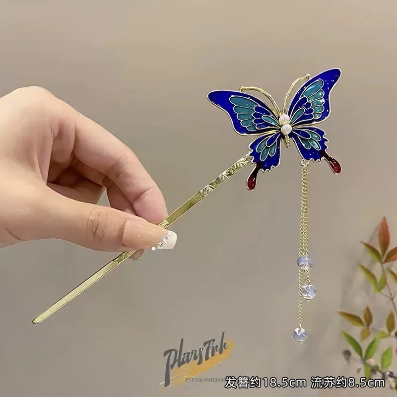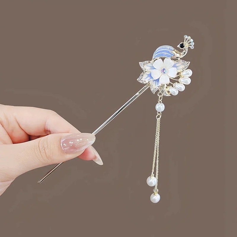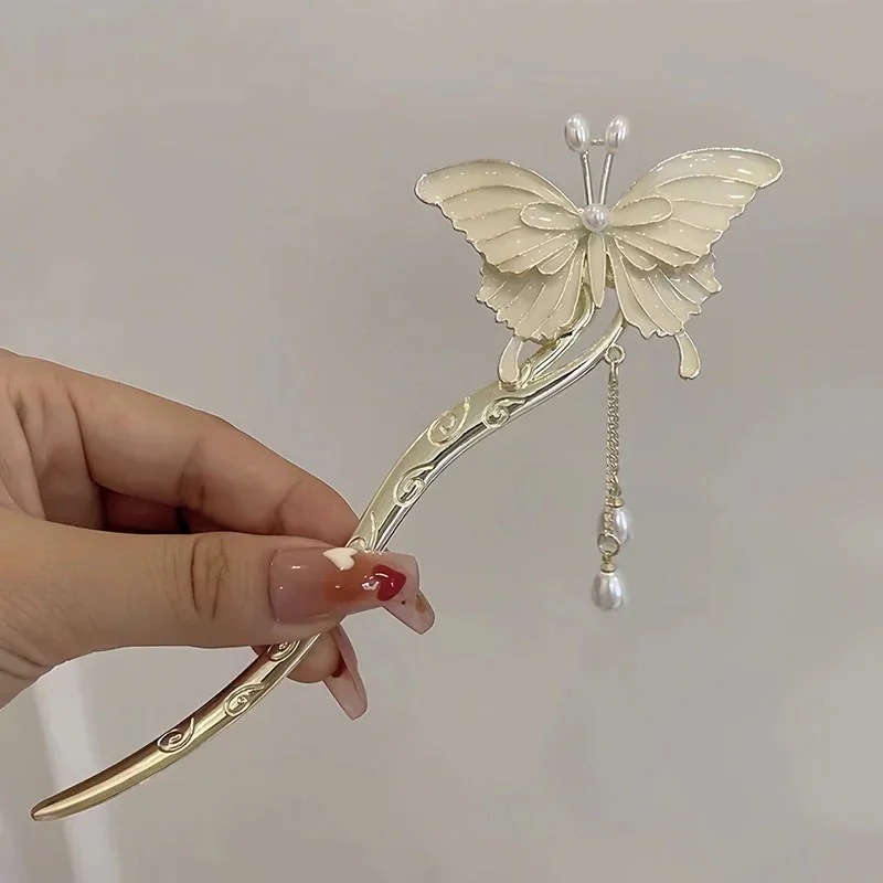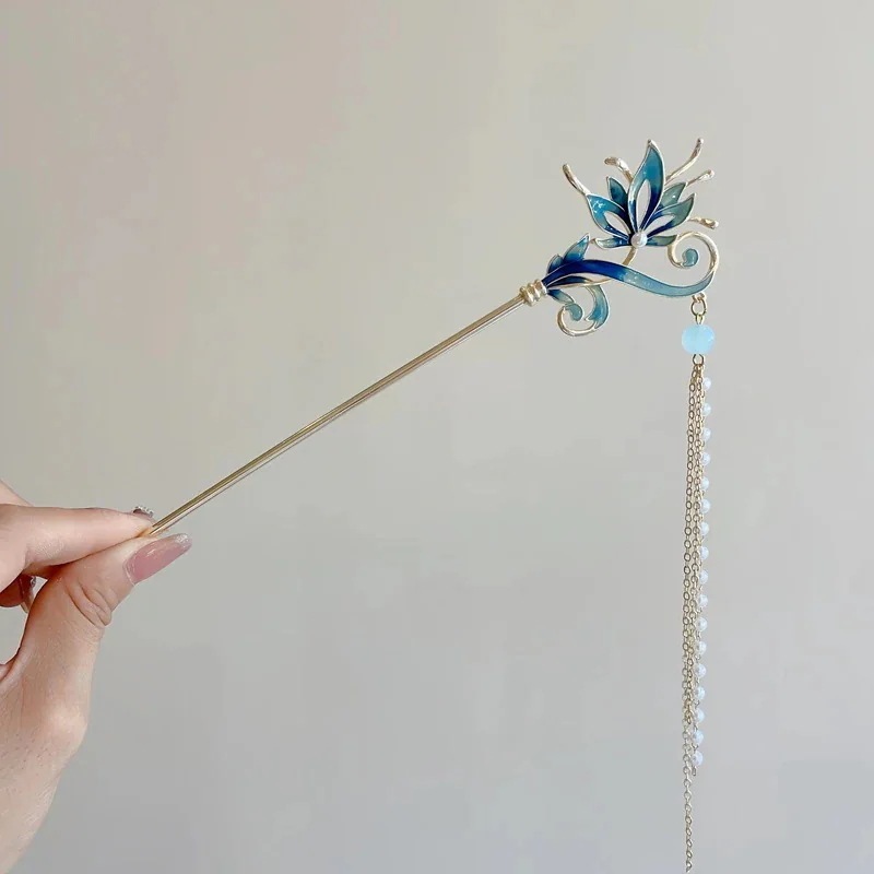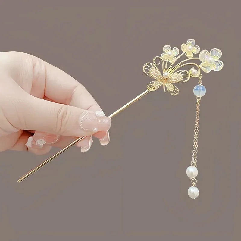 古風なファッションの花模様髪飾り流蘇と真珠の漢服・旗袍用髪飾り巻き髪用髪飾り 高級レトロなステップ揺れ蝶髪飾り