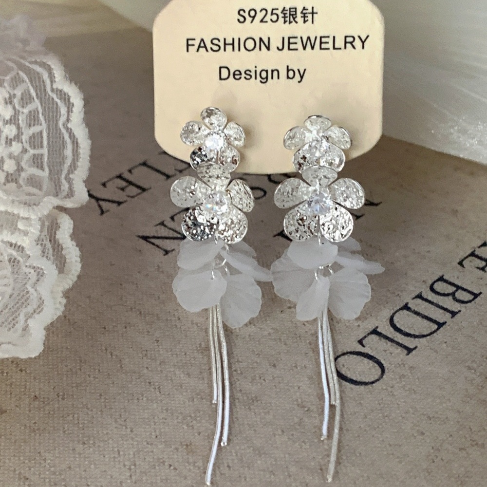 大人アクセサリー 【リゾート風】ロングフラワーピアス フリンジ付き 丸顔/四角顔対応 バカンス向け