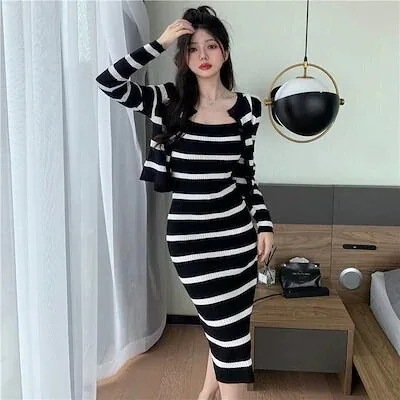 ファッションカーディガン セクシー 着痩せキャミワンピ2点セットレトロニットのワンピーススーツ