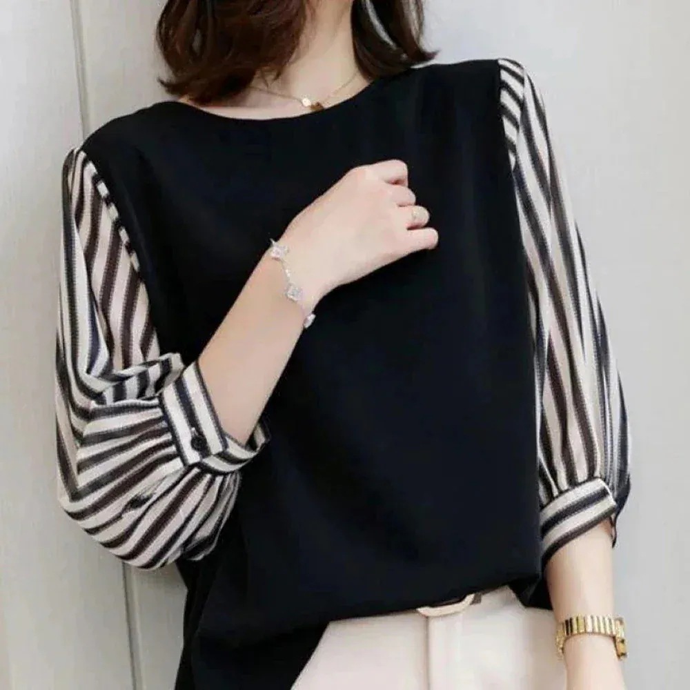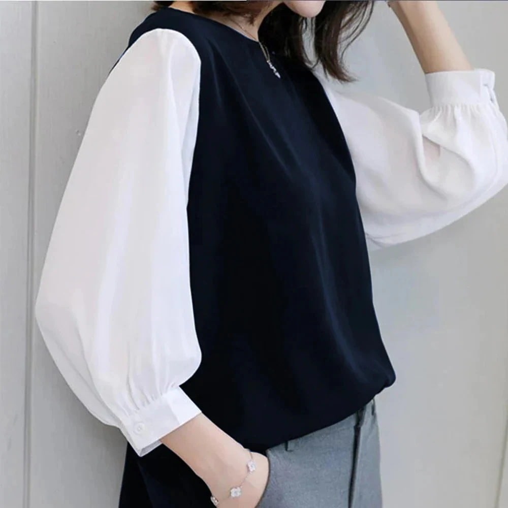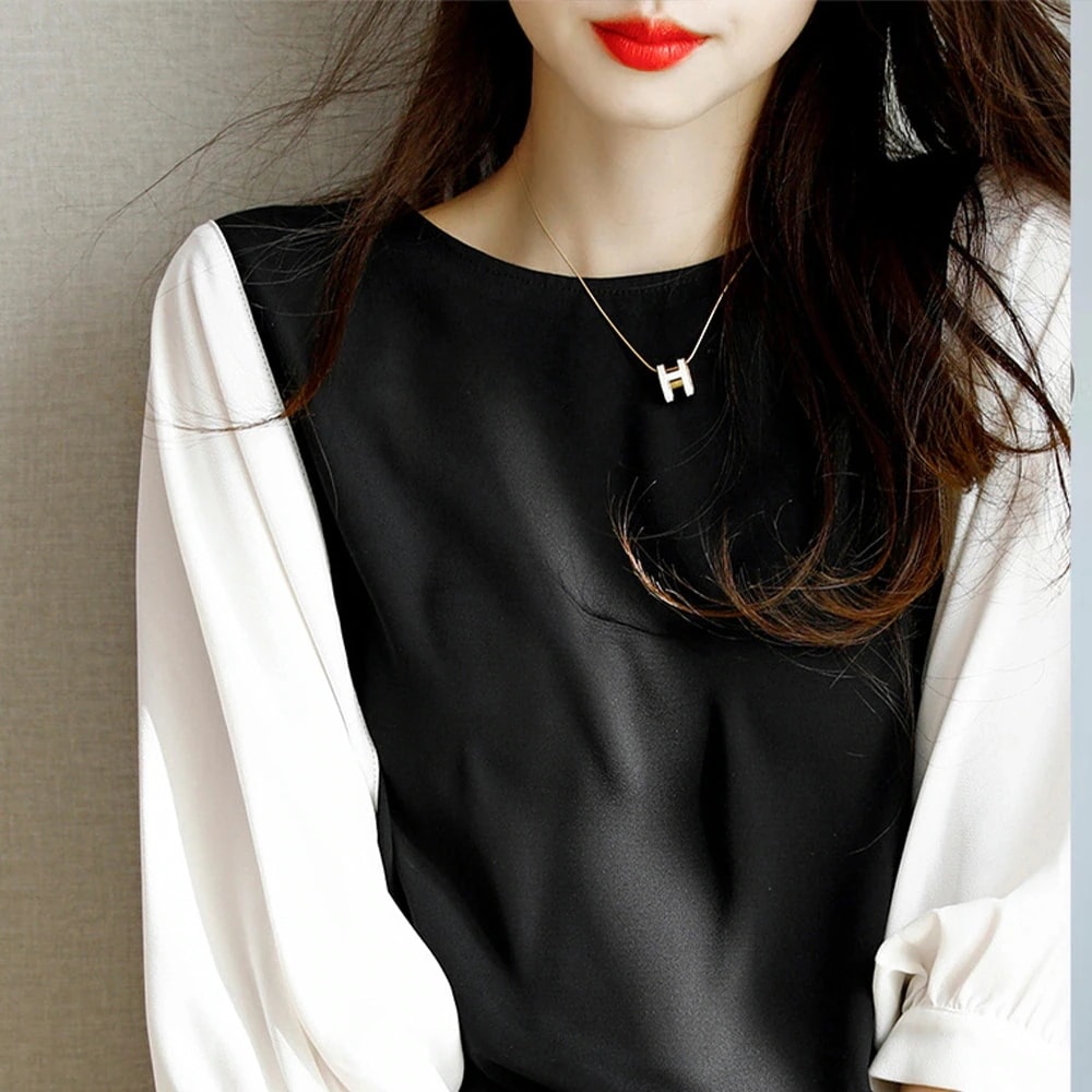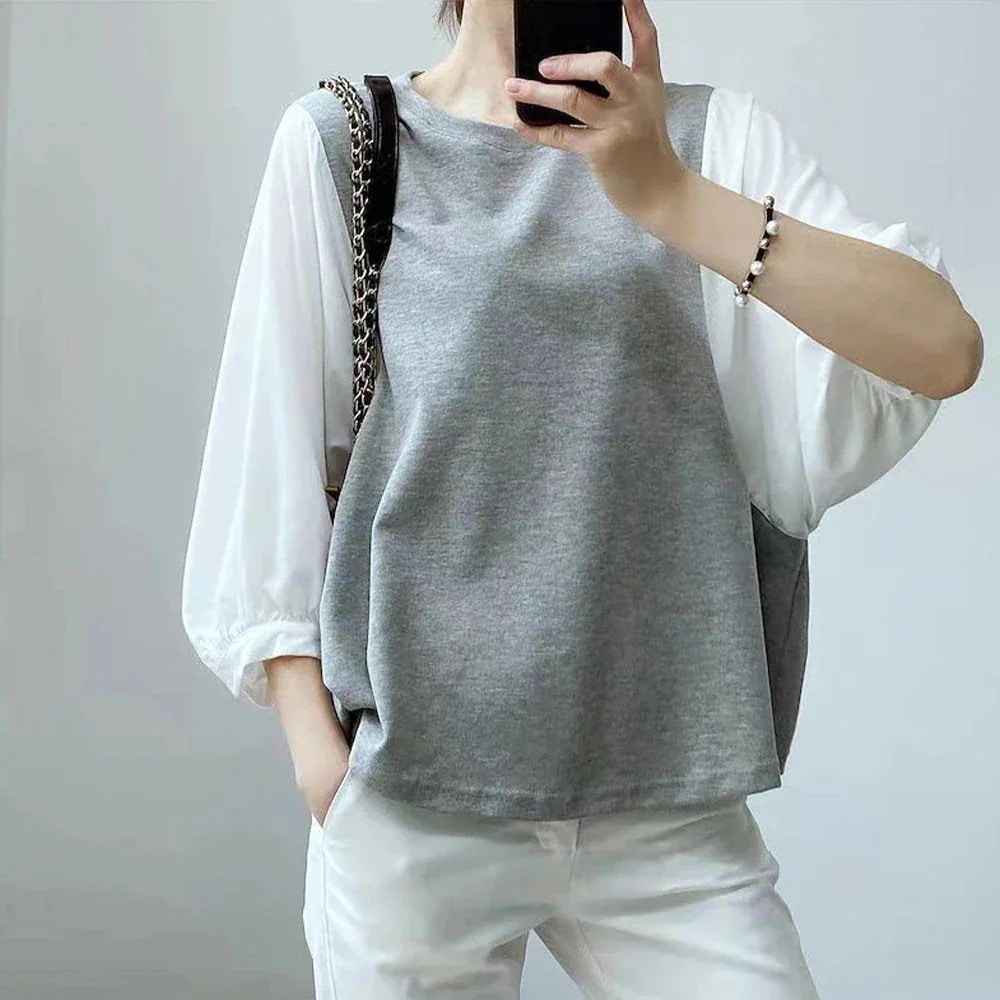 即納!韓国 ファッション レディース /春夏新作 切り替え 重ね着風 シンプル長袖/おしゃれ 可愛い/ トップス カジュアルクルーネックゆったりシャツ