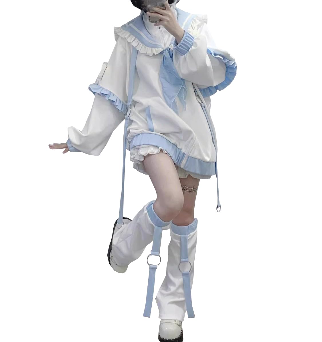 2点セットパーカー 地雷系 水色 ルーズソックス コート レディース 長袖 チェーン付き 天使界隈 翼 服 レース セーラー服 リボン フリル 可愛い トップス平価