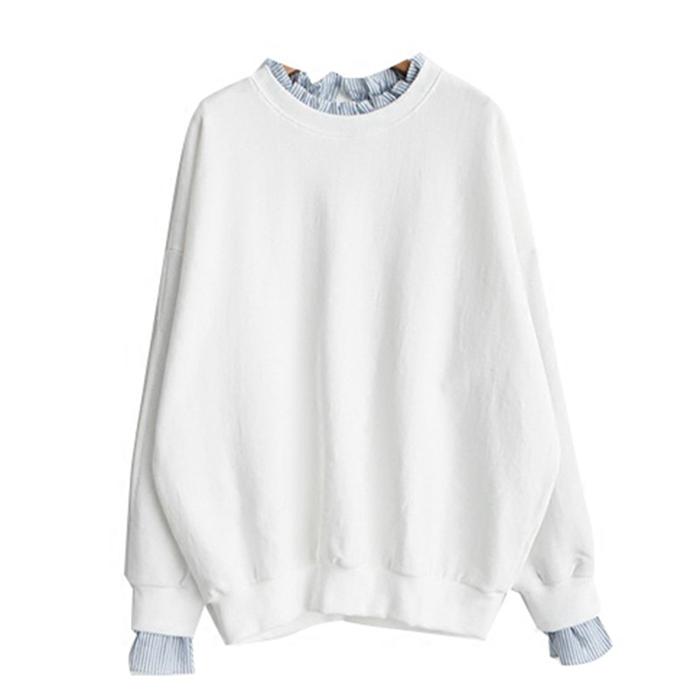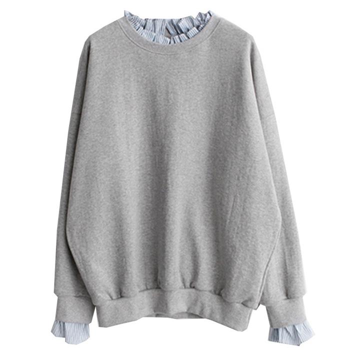気質 重ね着風 トレーナー ストライプシャツ スタンドカラー フリル 付け袖 レイヤード スウェット フリルカラー コーデ ゆったり 体型カバー