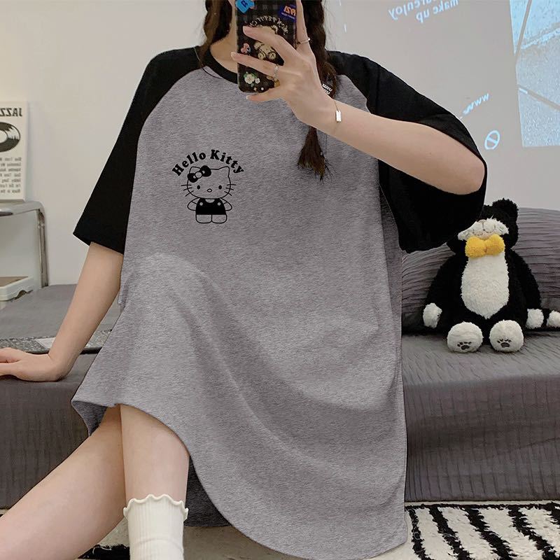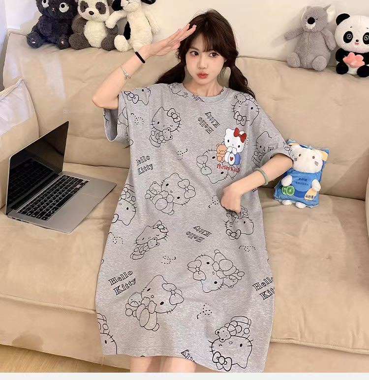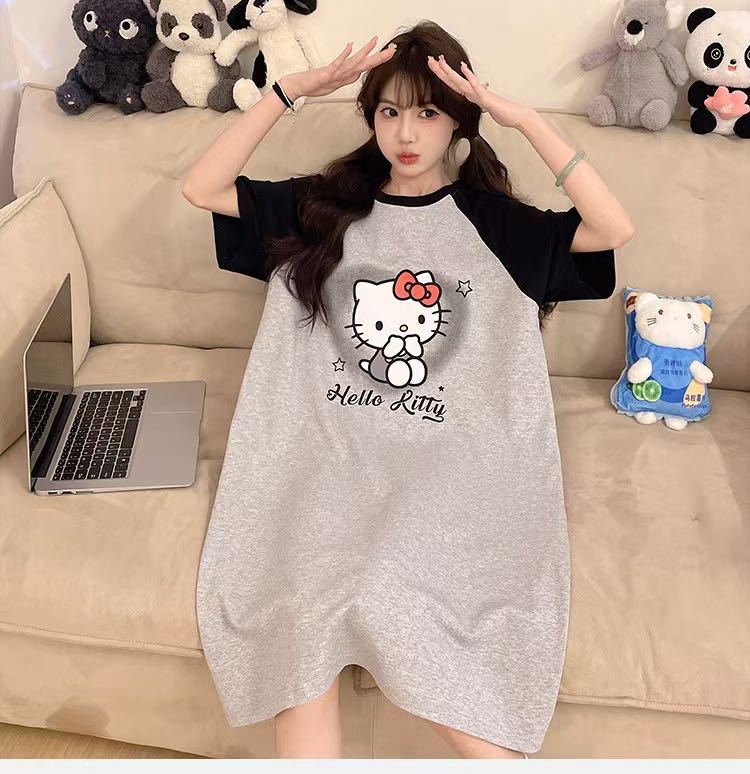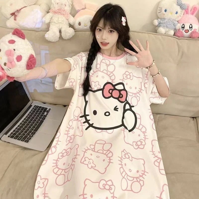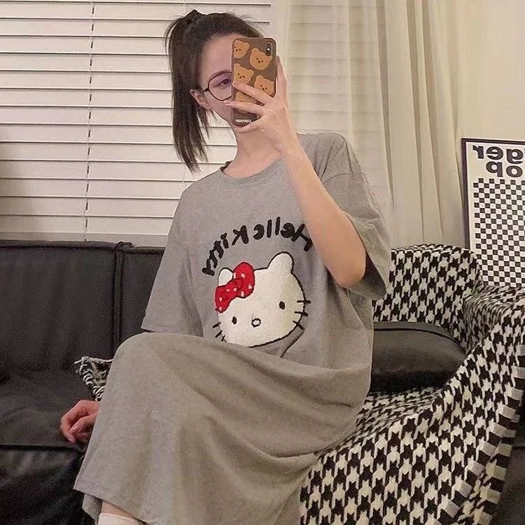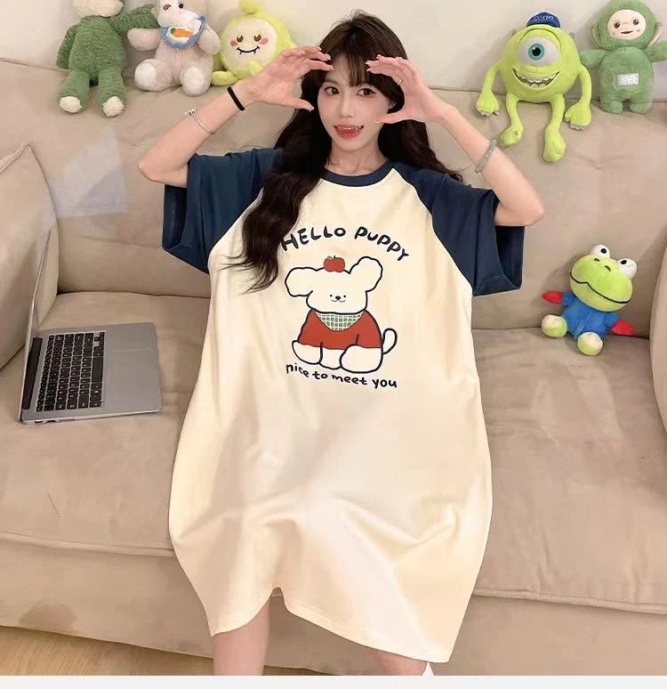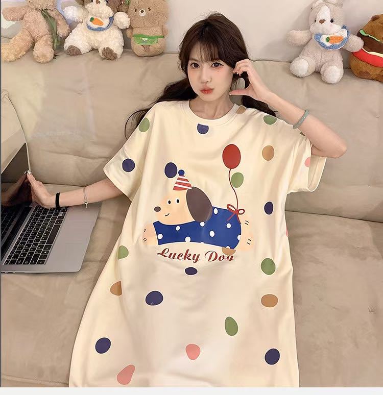 【2件2 0 0円 引き】2025スリーパー女子春夏レディース半袖パジャマ丸首可愛いkt猫2025型学生用ロングスカートルームウェア