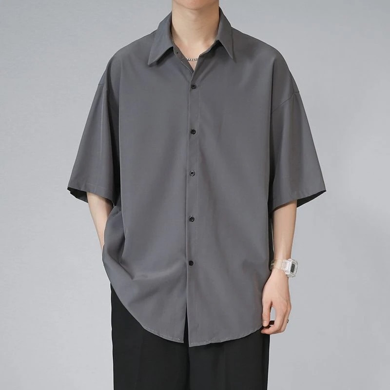 アイスシルク素材のショートスリーブシャツ夏向けメンズファッションブランド カジュアルジャケット高級感あふれるクールな黒シャツ薄手タイプでゆったりとしたシルエットのシャツ