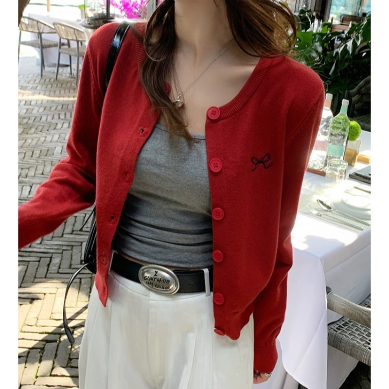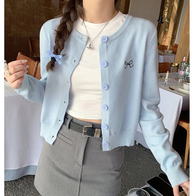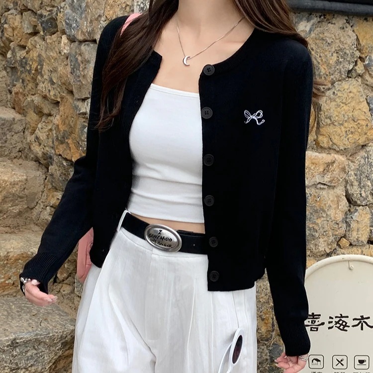 【SNSで話題中】カーディガン ニット レディース トップス 前開き ニットセーター リボン刺繍 高級感 アウター ふわふわ 長袖 セーター 無地 上着 シンプル きれいめ 韓国ファッション