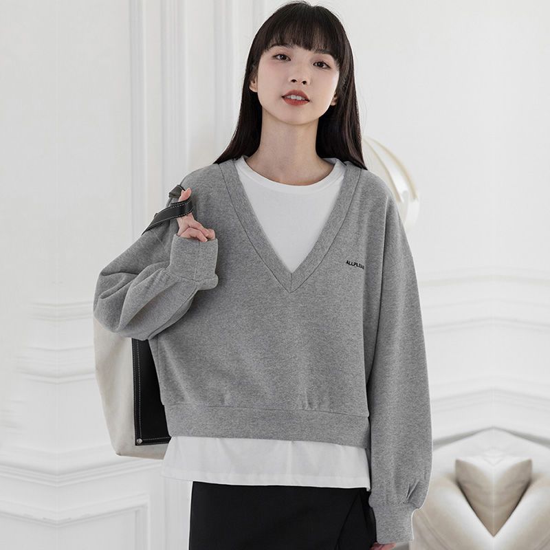 パーカー ゆったりスウェット純綿スウエット女性 秋モデル韓国版ゆったりキャップなし薄手タイプ フェイクレイヤード v襟上着 マウンテンパーカー