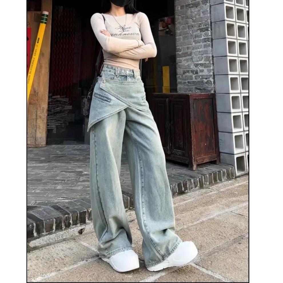 女性用大サイズのクールなハイウエストジーンズビンテージなストリート風で個性的なデザイン着脱式のウエストベルト付きで重ね着に適した広がりのある脚丈のパンツです