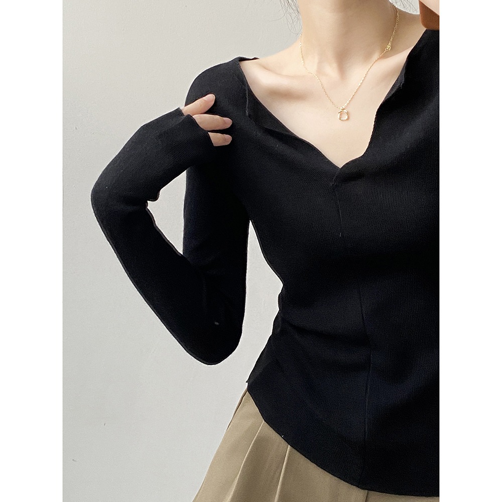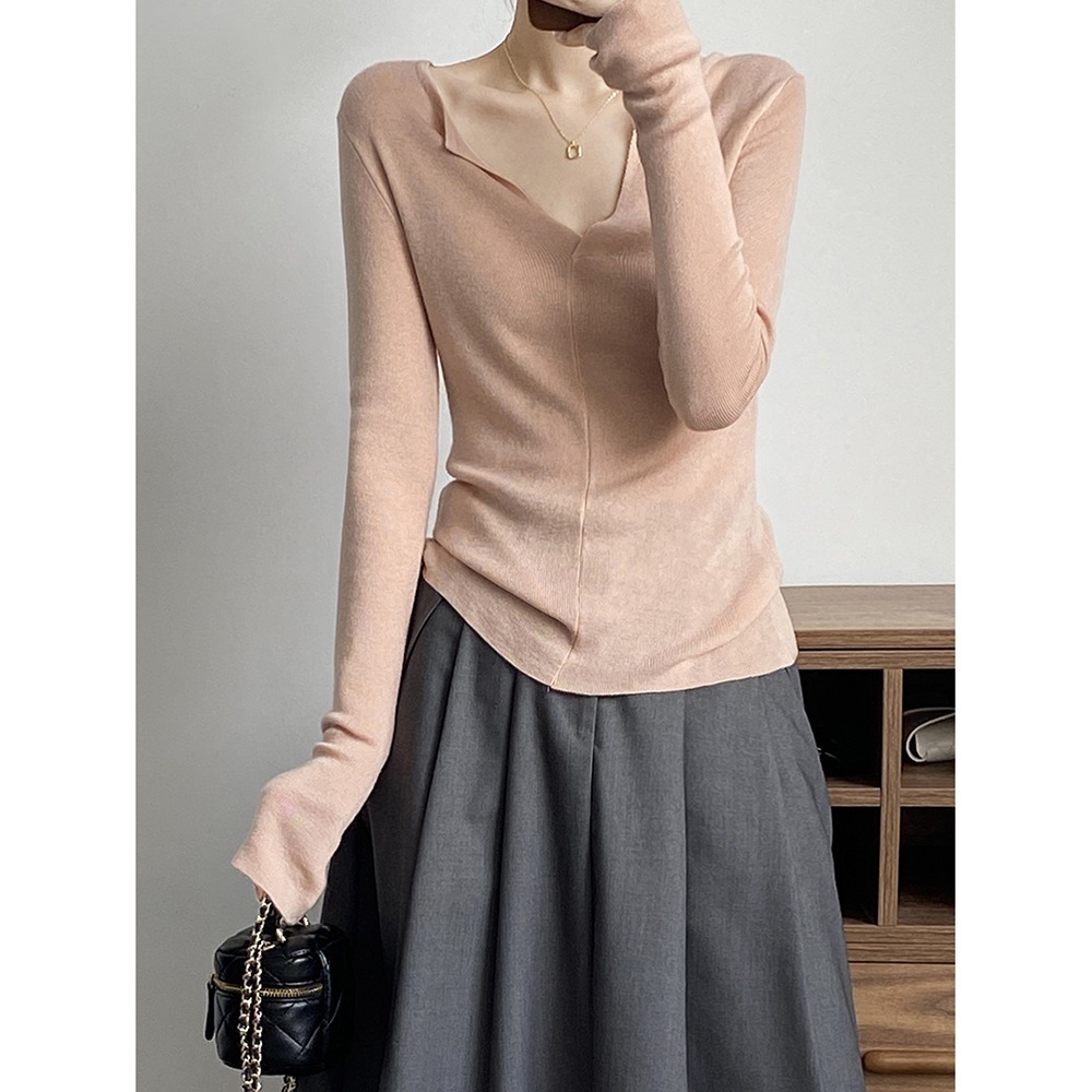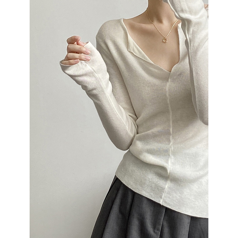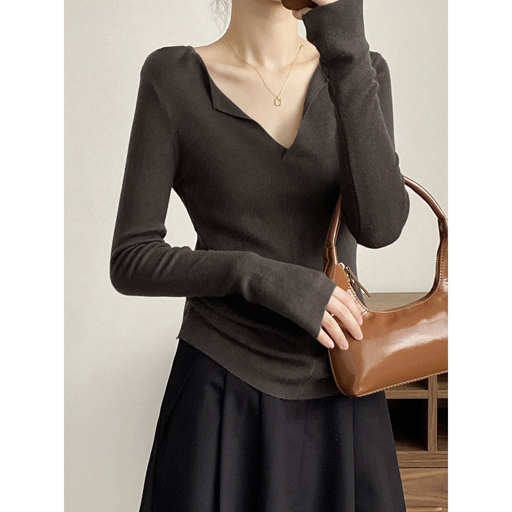 フランス風Vネック開襟ニットセーター(女性用) 秋の新作インナーとして上品なシルエットのロングスリーブトップス