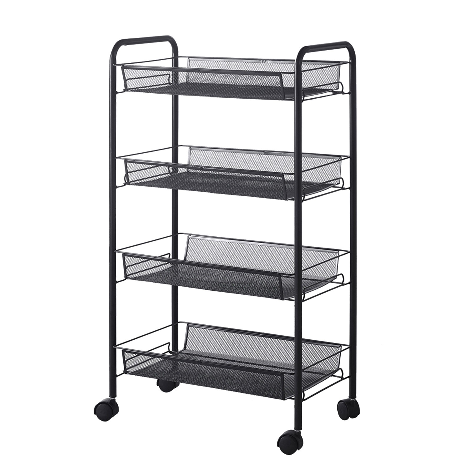 「新店セ ール中*即納」キッチンワゴン スチール製 キャスター付き 4段 メッシュ底板 バスケット ラック 収納 メタル 隙間収納 シェルフ フック付き カート 棚 新生活 雑貨 組立簡単