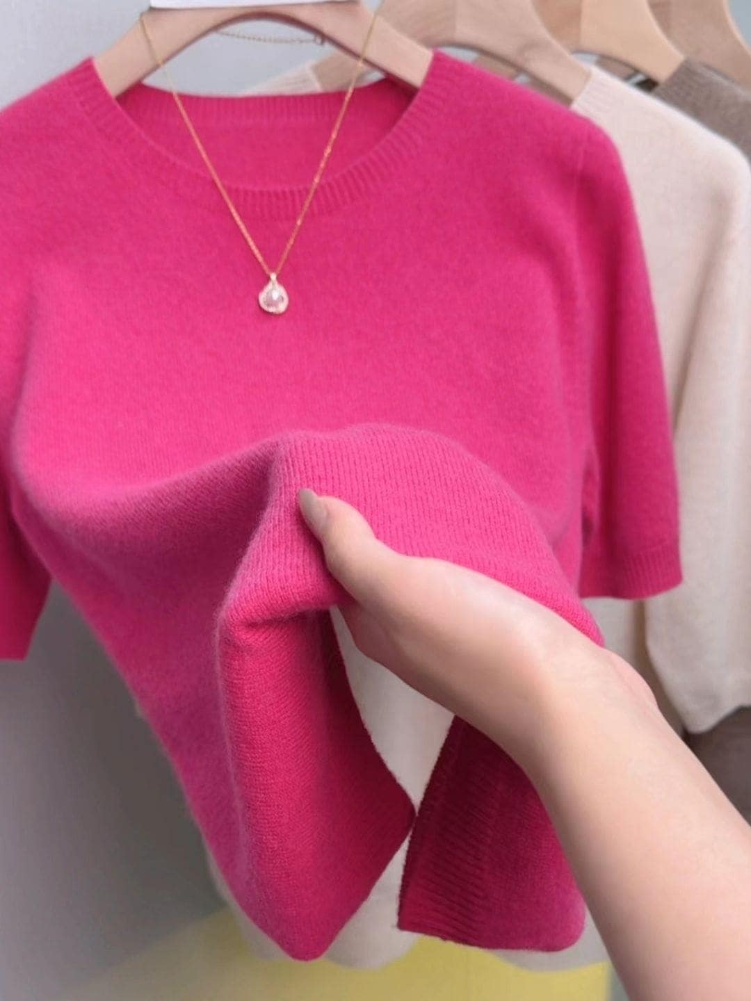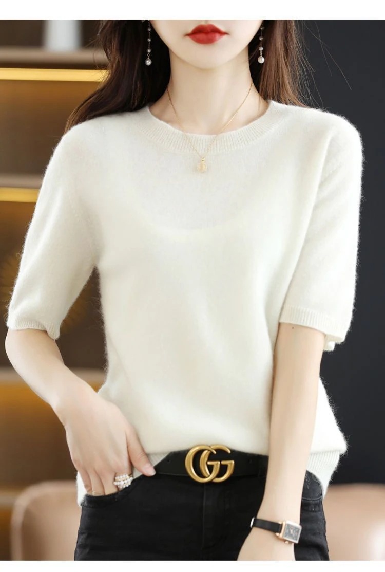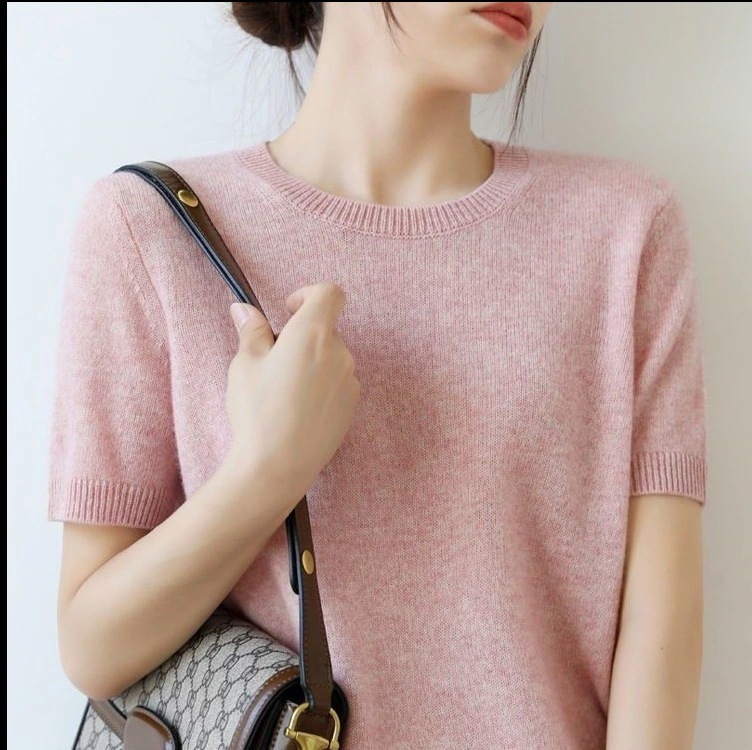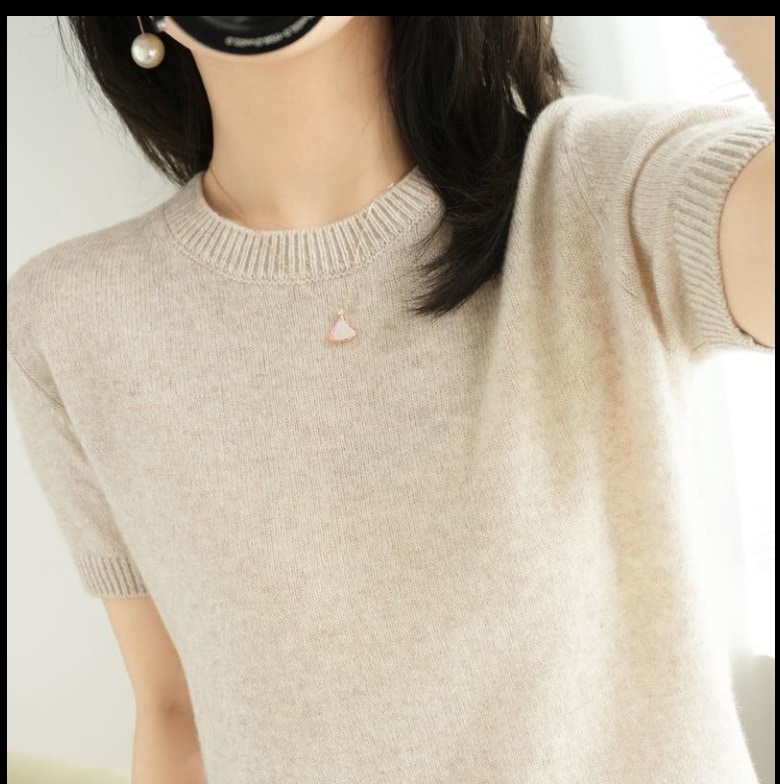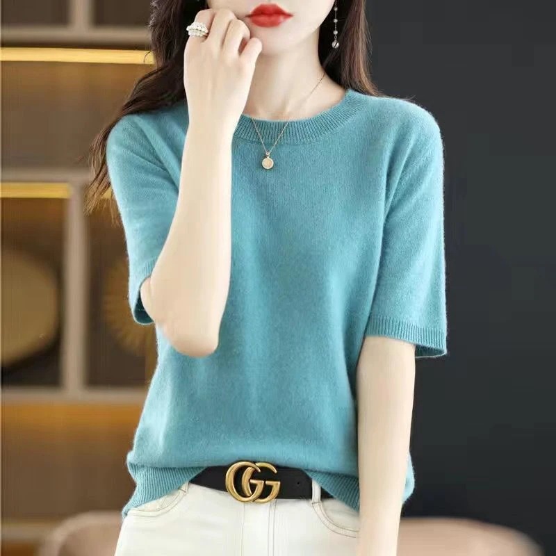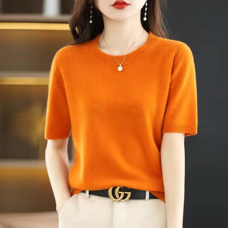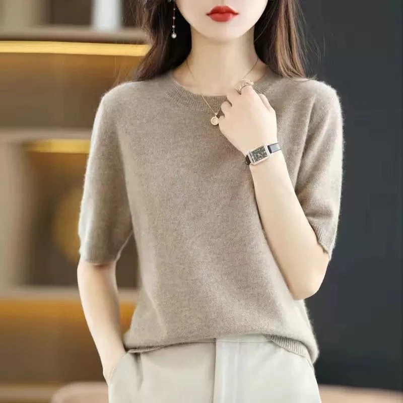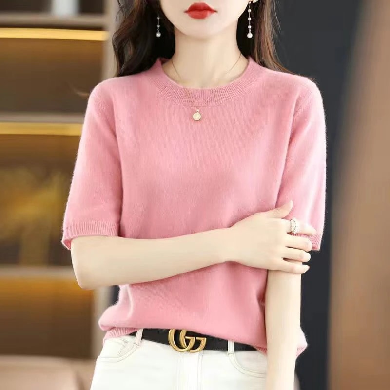 【2025秋服新作】【2個購入ごとに200/OFF】無地 半袖 ラウンドネック ニット初秋のオシャレニットTシャツ ニット5分袖 柔らかい 半袖シャツ 通勤  ゆったり 垂感 トップス 無地レディー