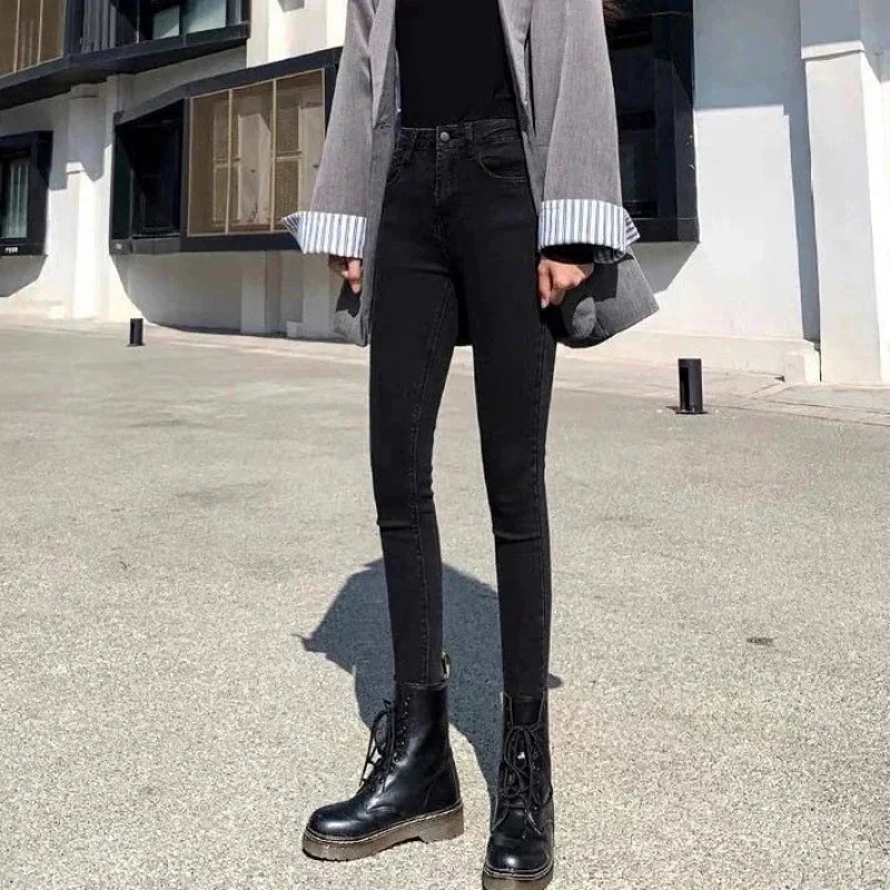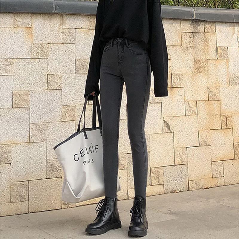 脚長効果!スキニーデニムパンツジーンズ女性ハイウエストグレー新作春黒ズボン細身 ストレッチ お腹 タイ韓国ファッション