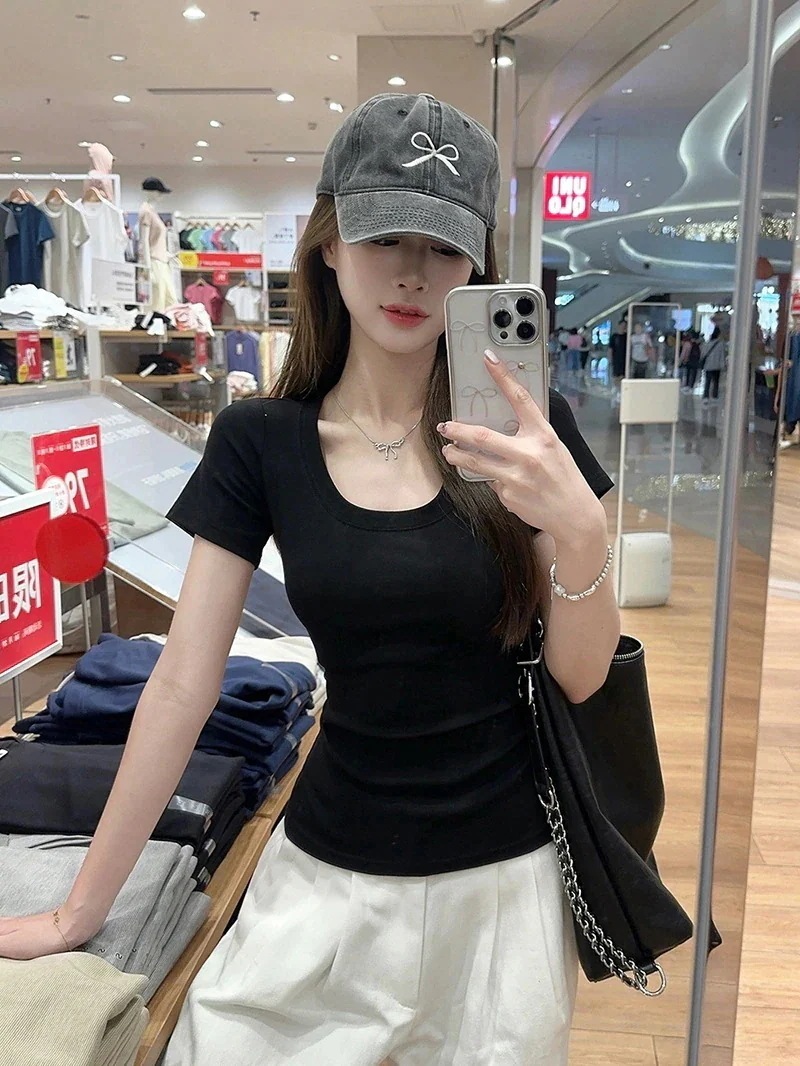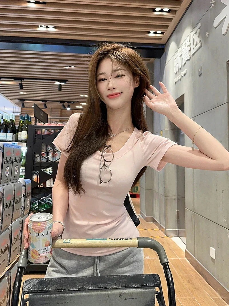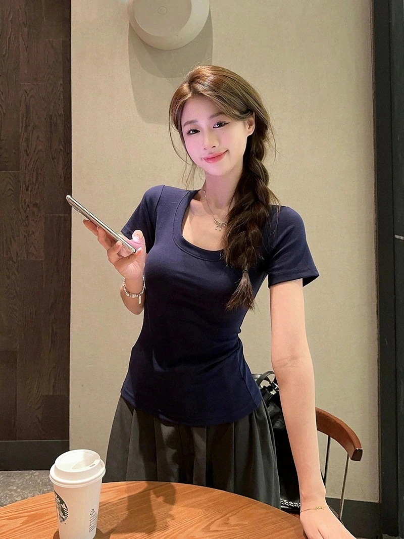 2025 春夏トップス 半袖 Tシャツ 韓国 レイヤード風 ショート丈 着痩せスリムかわいいフレンチセクシーラウンドネックおしゃれスリーブカジュアルコーデファッション系レディースお出かけ T