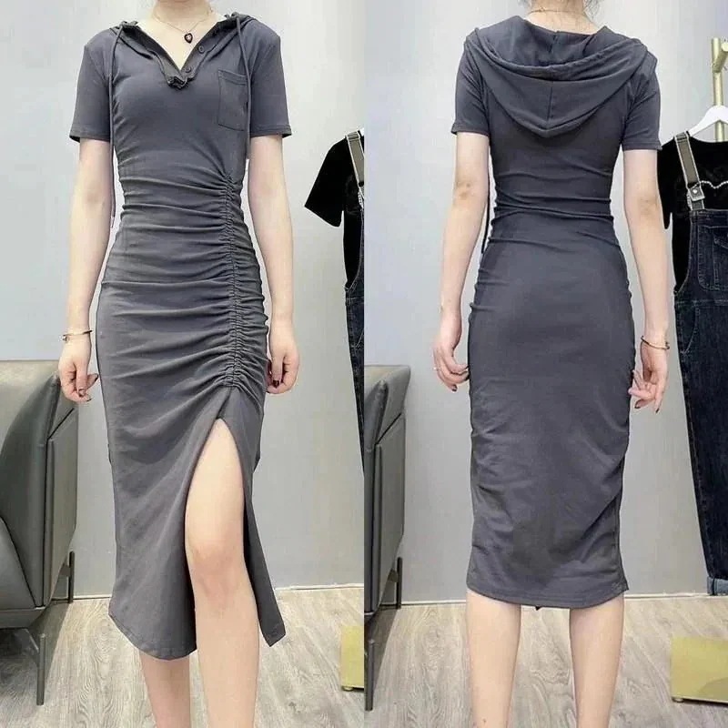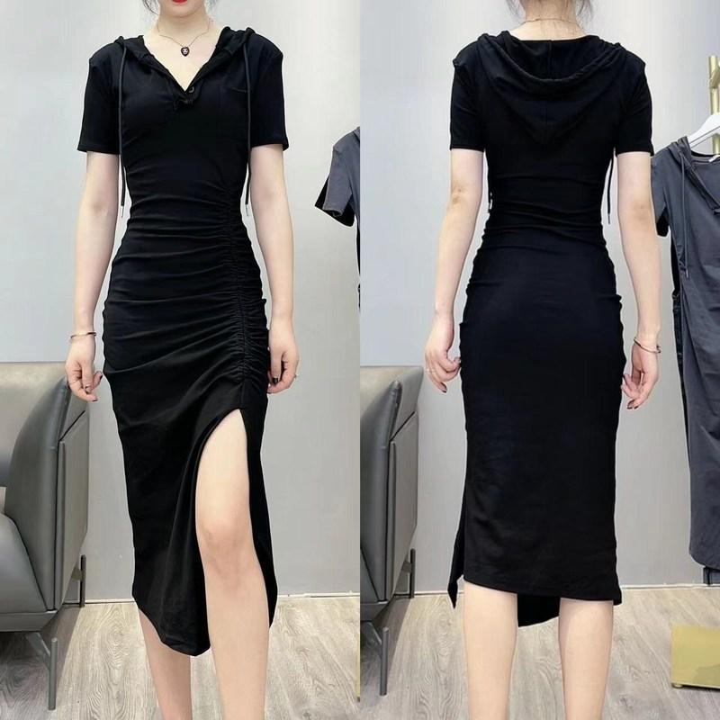 パーティードレス ドレス ワンピース 愛されドッキングワンピース 薄手のドレスの女性の夏の新しいスタイルスリムウエストフード付き巾着デザインカジュアル気質スカートスリットロングスカート