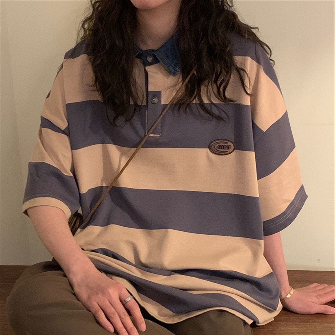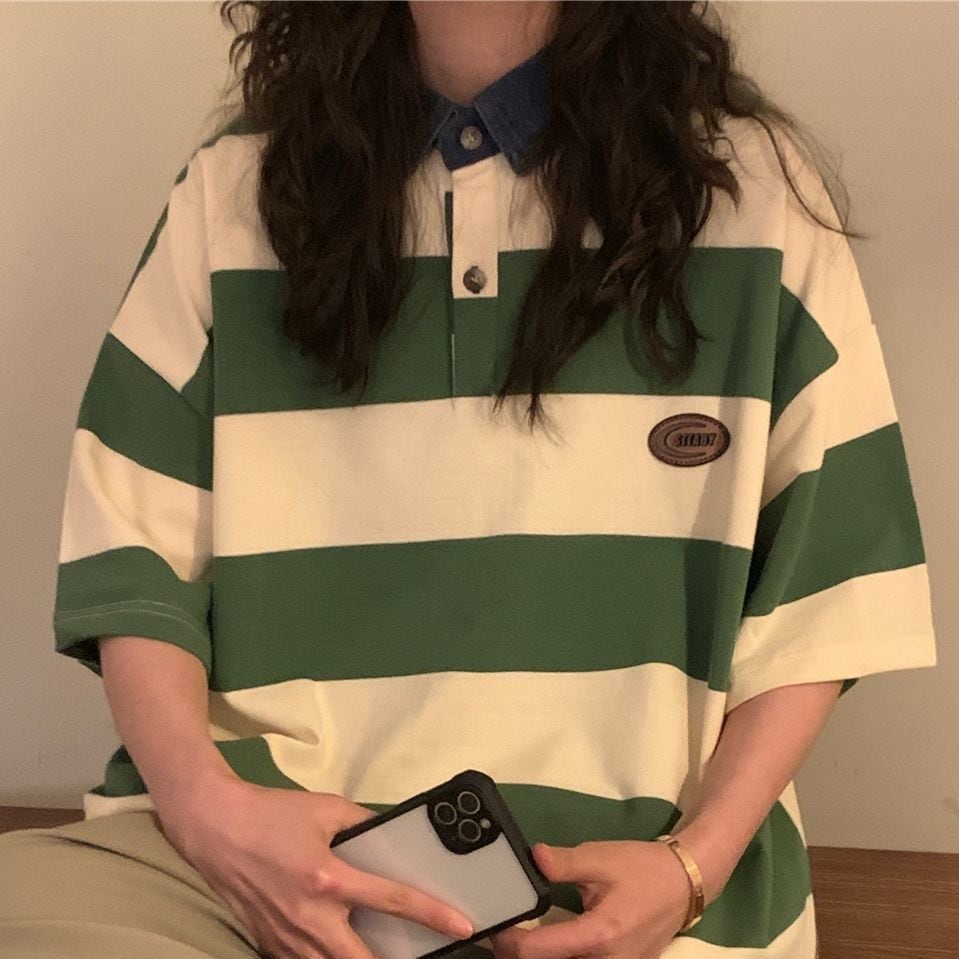 Tシャツ夏ゆったりレトロストライプ半袖Tシャツ女学院風キルティング夏 Tシャツカットソー半袖Tシャツ