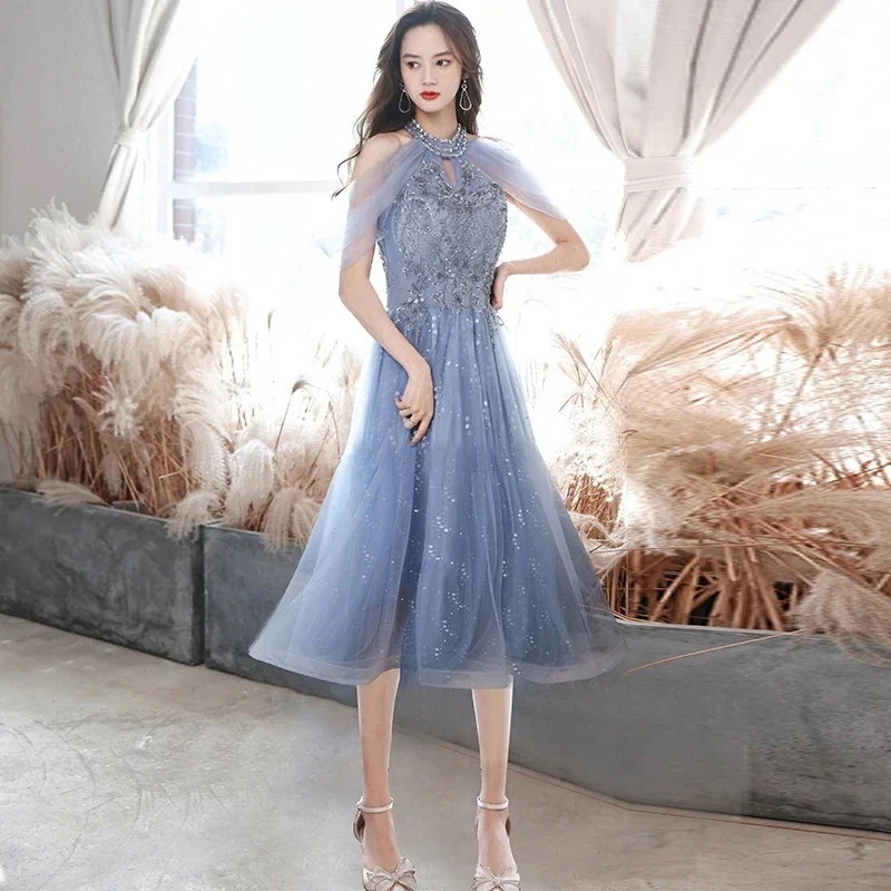 パーティードレス ドレス イブニングドレス女性新しいエレガントな気質人長いホストフランスの宴会青ロングドレス
