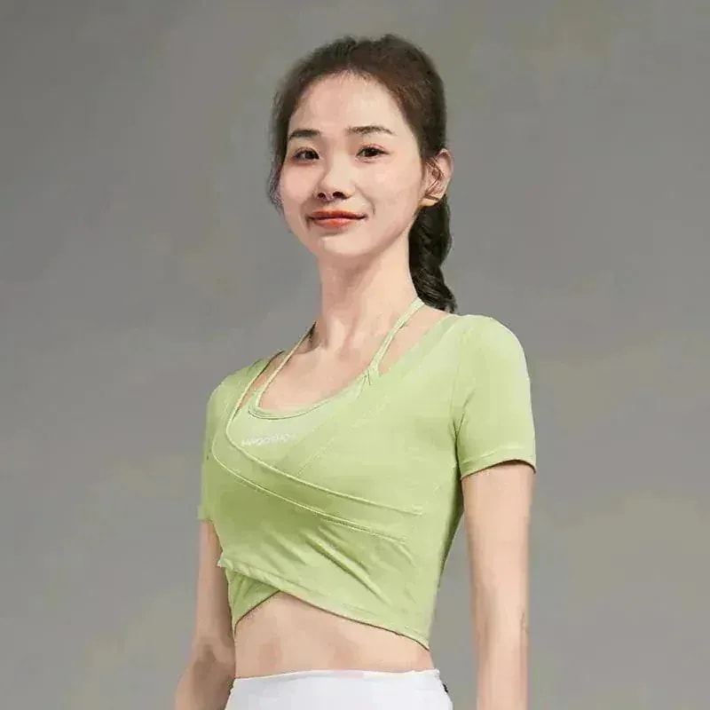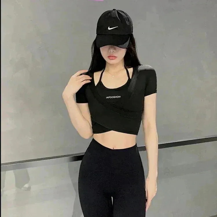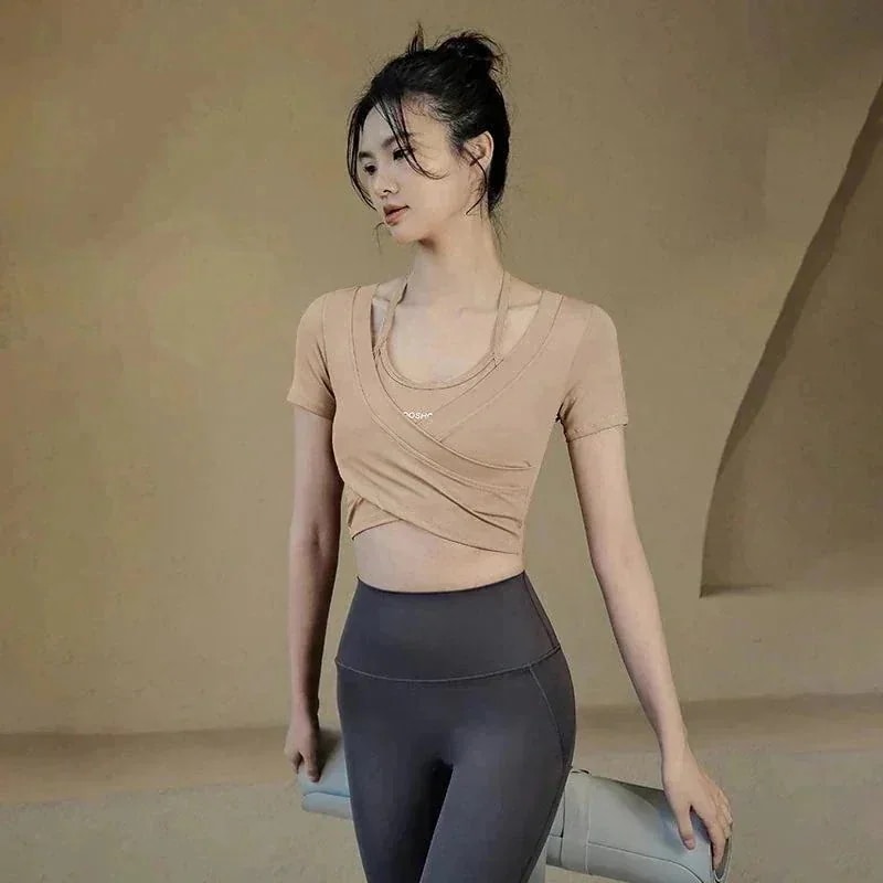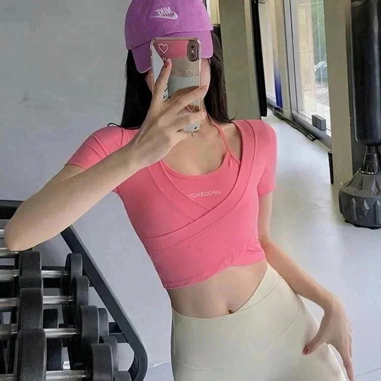 韓国ファッションおしゃれヨガウェアお家ヨガウェア女性ヨガウェア春 夏カップ付きインナーチェストパッド付き速乾性ランニング半袖Tシャツスリムトップスピラティストレーニングフィットネスウェア