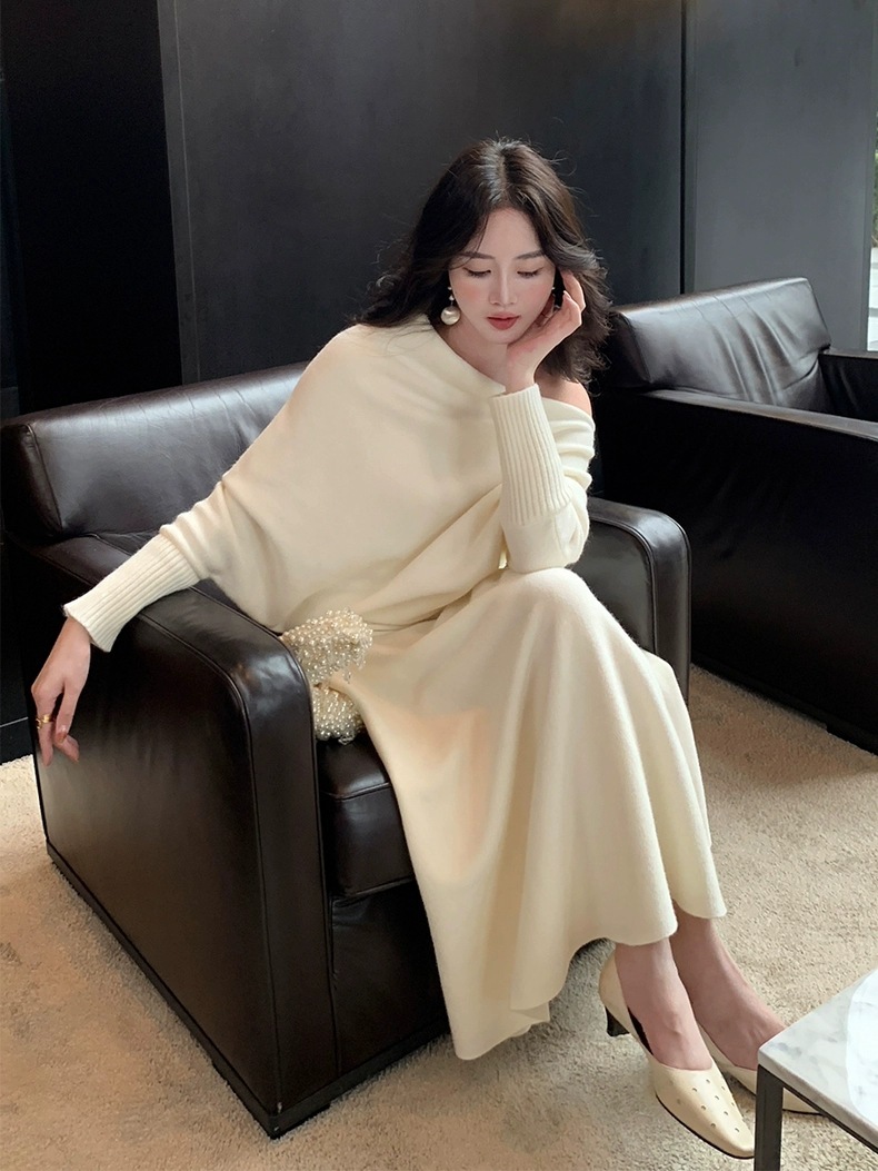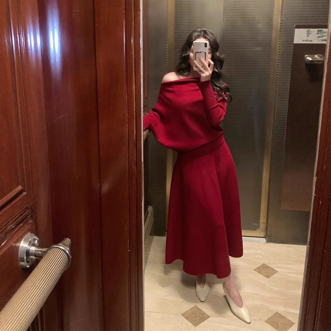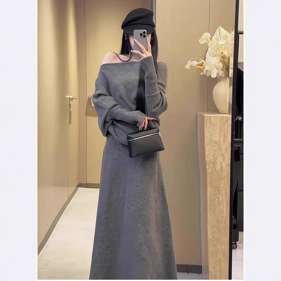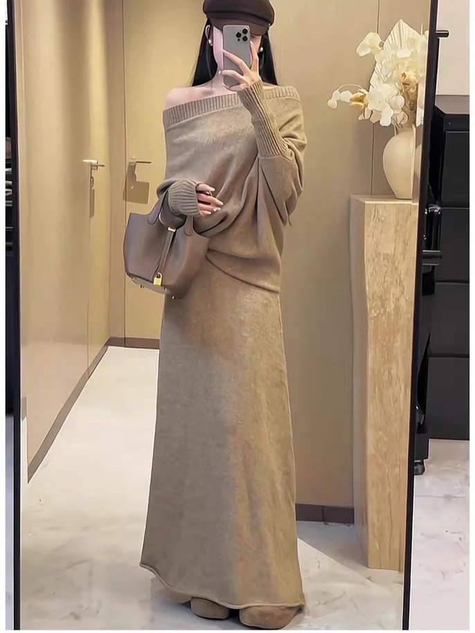 2025年秋冬オールマッチセータースーツレディース伸縮性カジュアルルーズ無地スラントカラーニットツーピーススカートスーツ