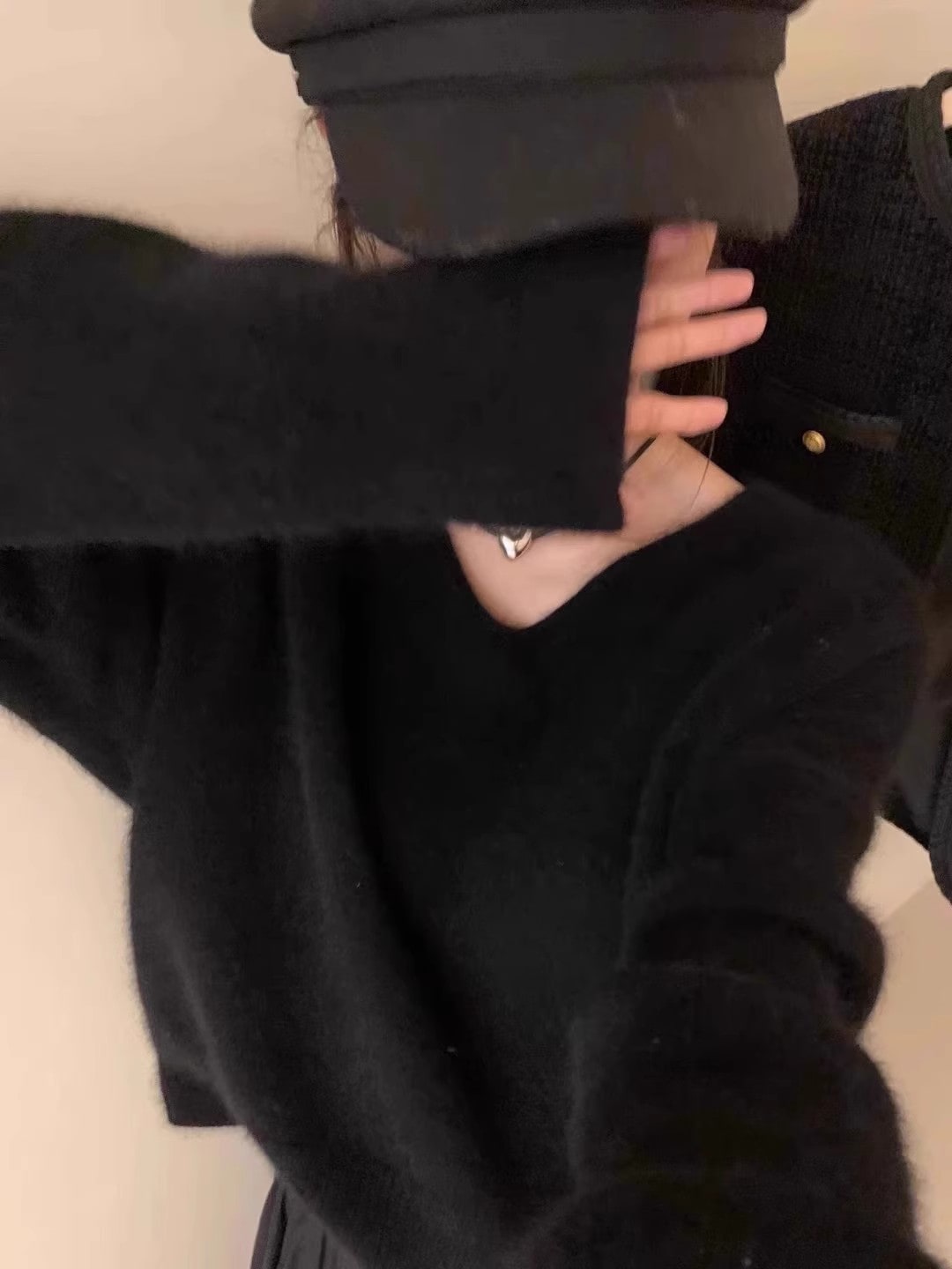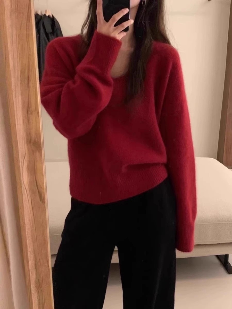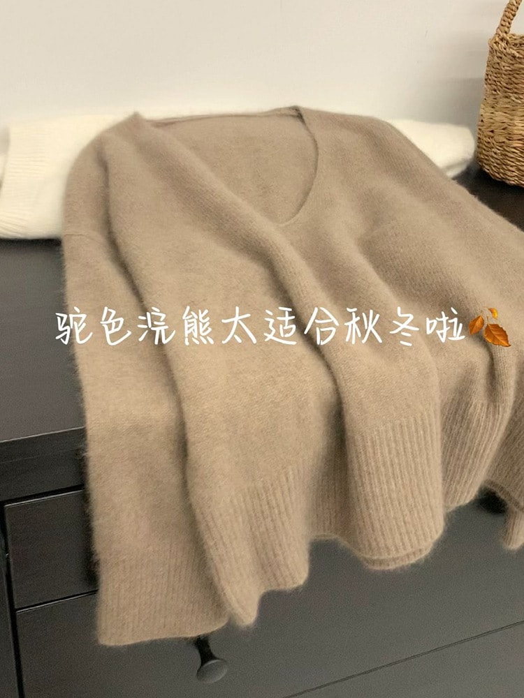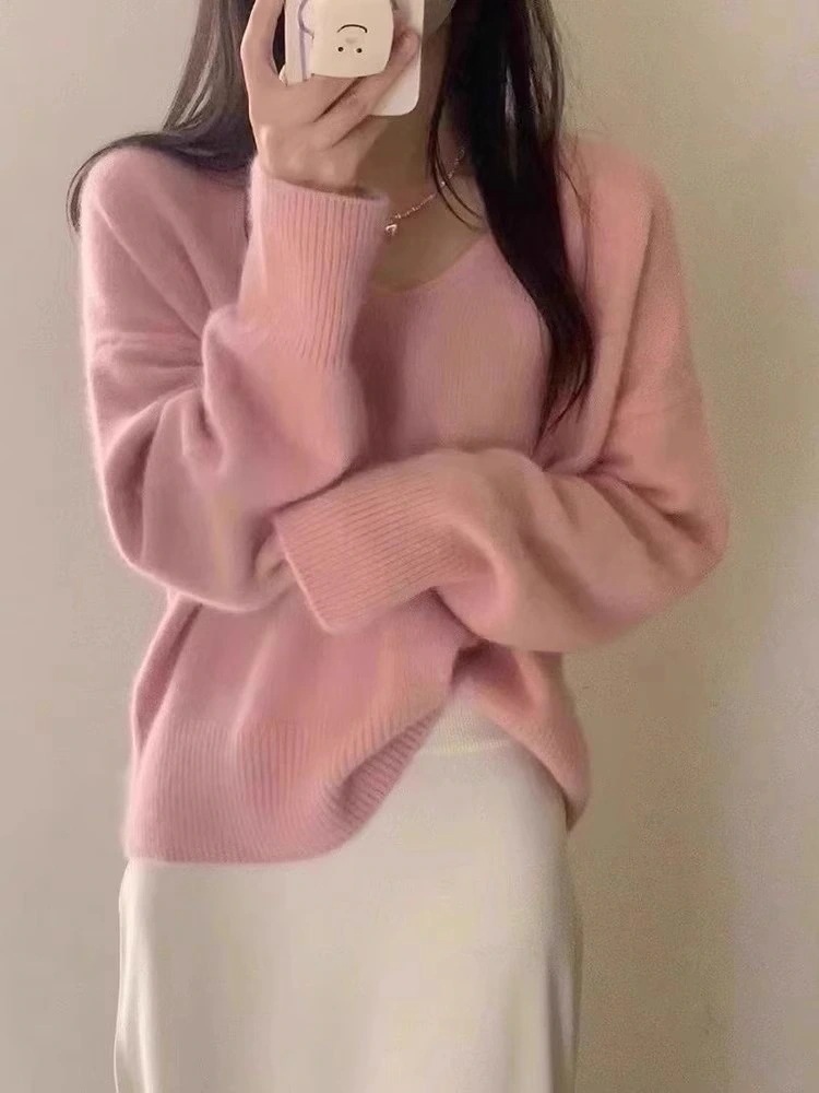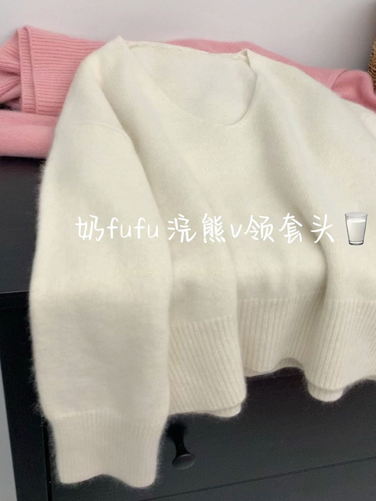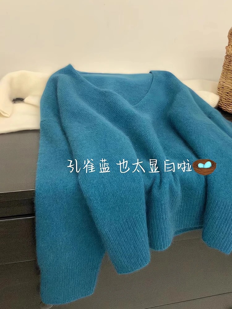 秋冬用の柔らかくて粘着性のあるピーコックブルーのVネックニットインナーウェアゆったりとした怠惰なセータープルオーバーショートトップ