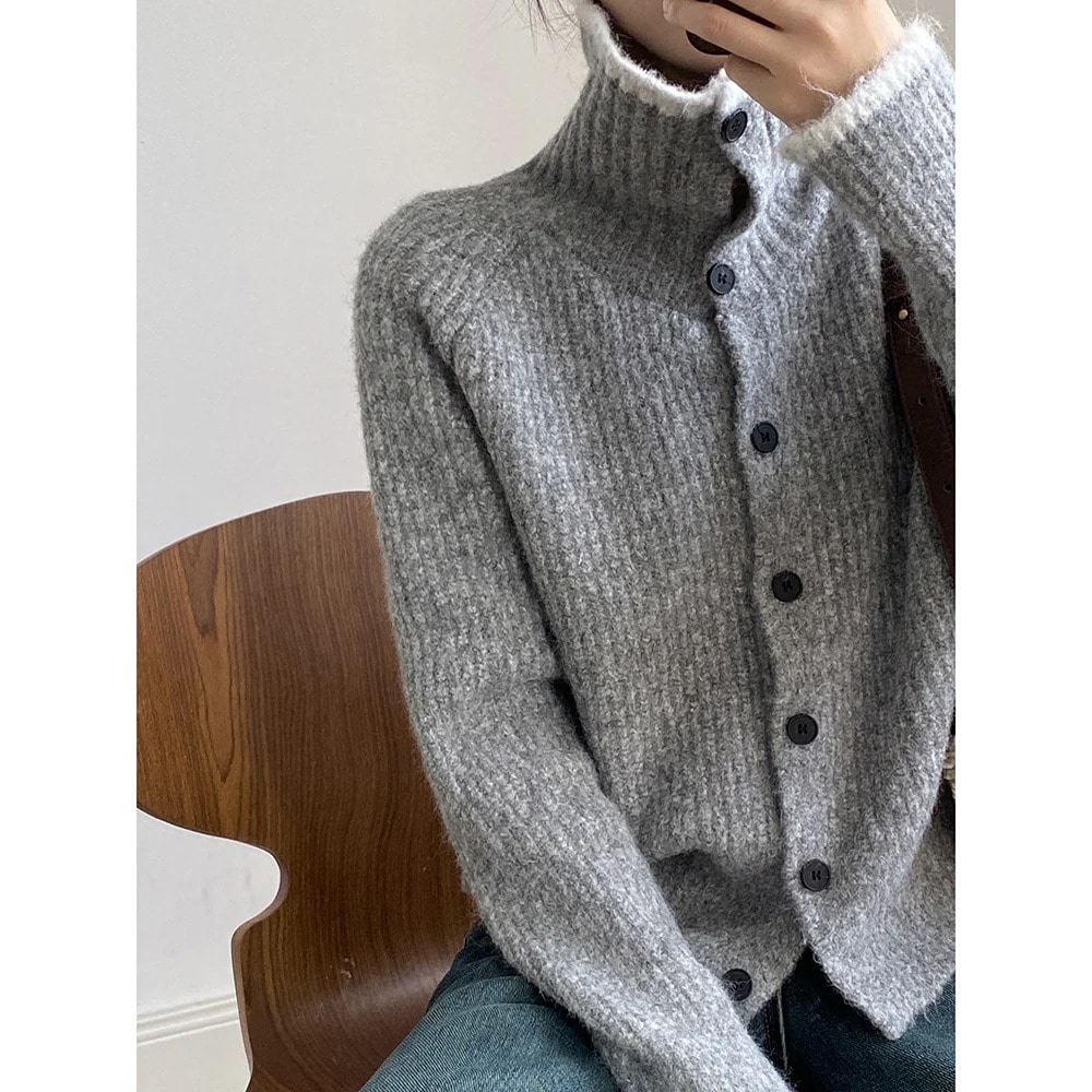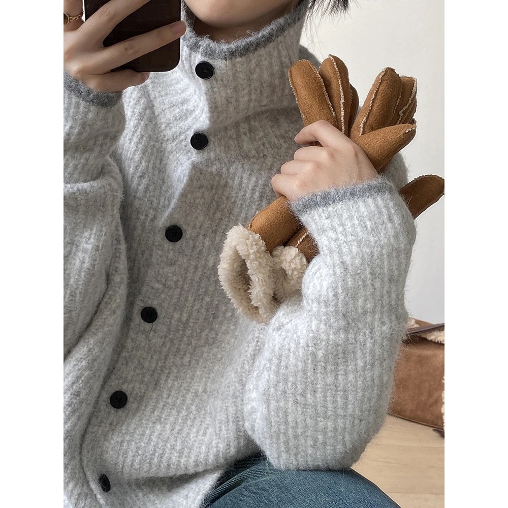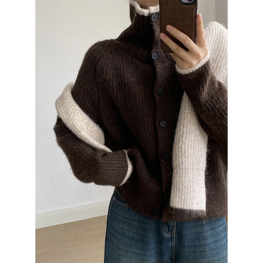 コントラストカラーのラペルシングルブレストカーディガンセーターレディース秋冬ゆったりレイジーセーターコート