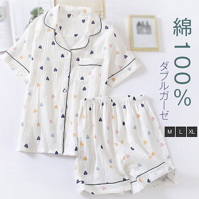 ダブルガーゼ ガーゼ パジャマ レディース 夏 半袖 ハーフパンツ 前開き 綿 総柄 ルームウェア ハート柄 二重ガーゼ ナイトウェア 上下セット トップス ボトムス ウエストゴム 大人 可愛い ふん