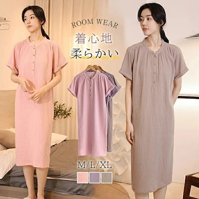 ダブルガーゼ ネグリジェ ワンピース レディース 夏 半袖 綿100% パジャマ ルームウェア 二重ガーゼ 部屋着 ガーゼ ワンピース ルームワンピース ネグリジェワンピース ガーゼワンピース コット