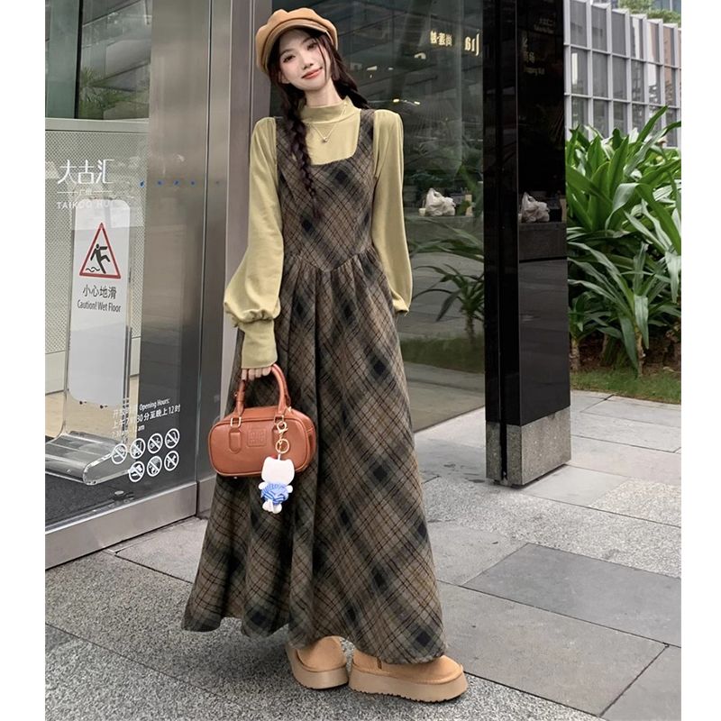 カレッジ風 ヴィンテージ 気質 チェック柄 サロペットスカート 肉を隠し 着痩せ ファッション ロング丈 スカート