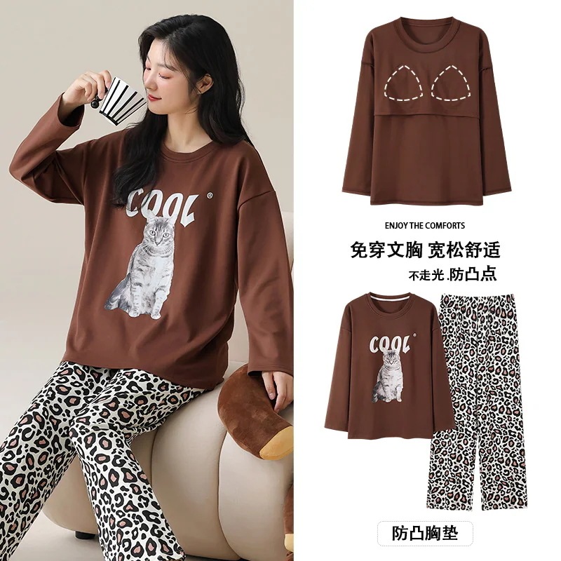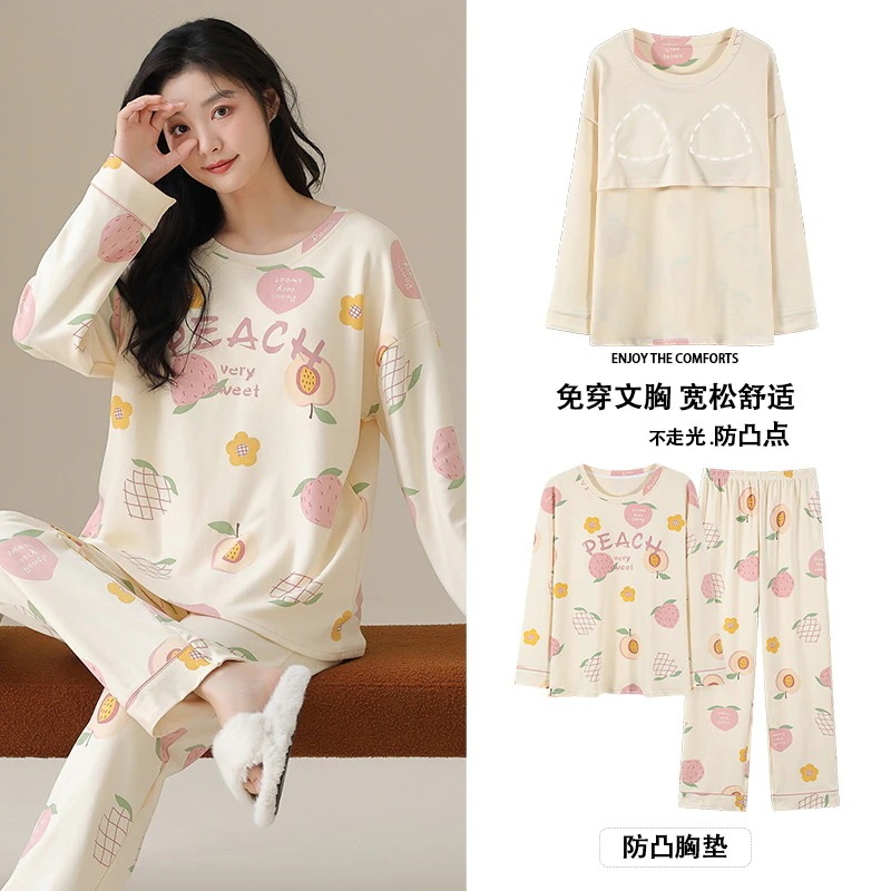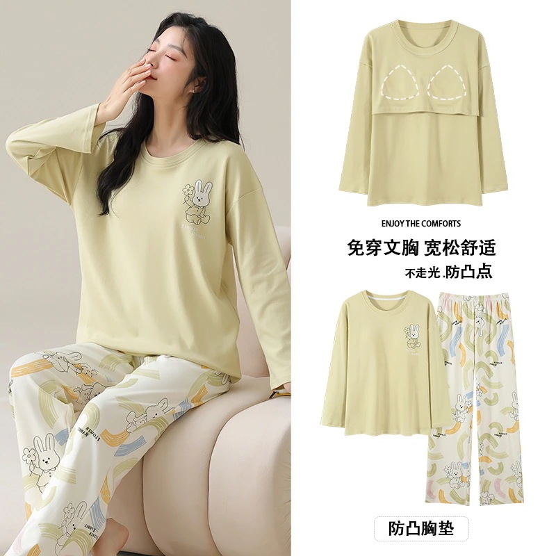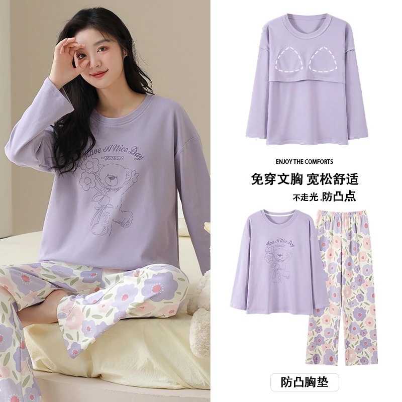 パジャマ女性用秋用長袖ロング丈カートゥーン柄胸パッド付きホームウェアかわいいセット