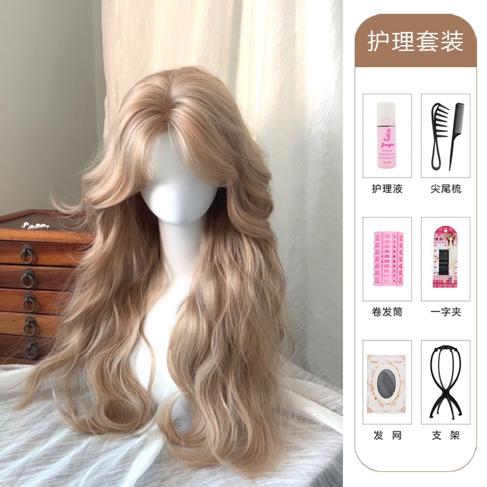 【クリームゴールド】上品なクリームホワイトとゴールドの卵型ロングカールヘアのミドルパートウィッグ
