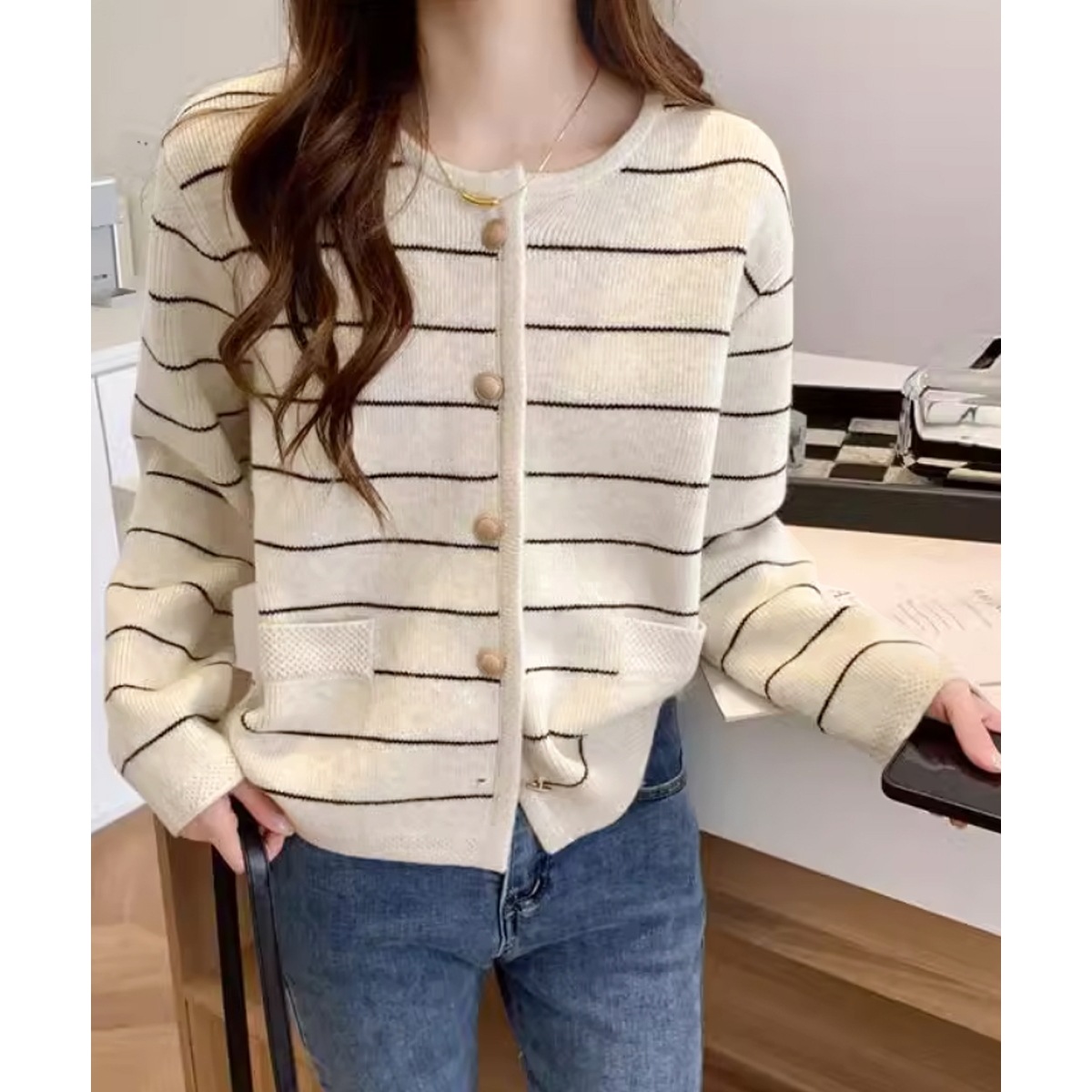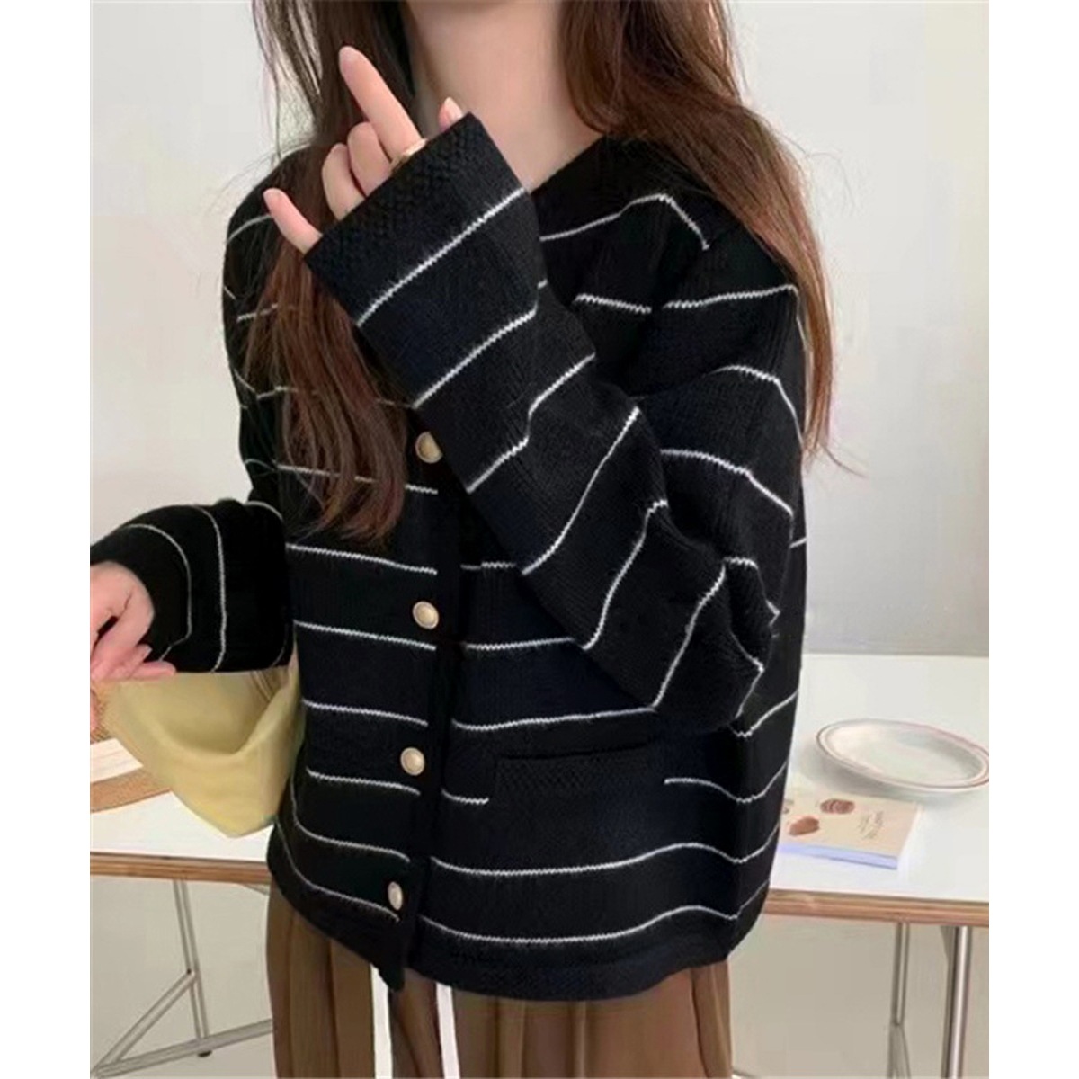 細ボーダーニットカーディガン レディース