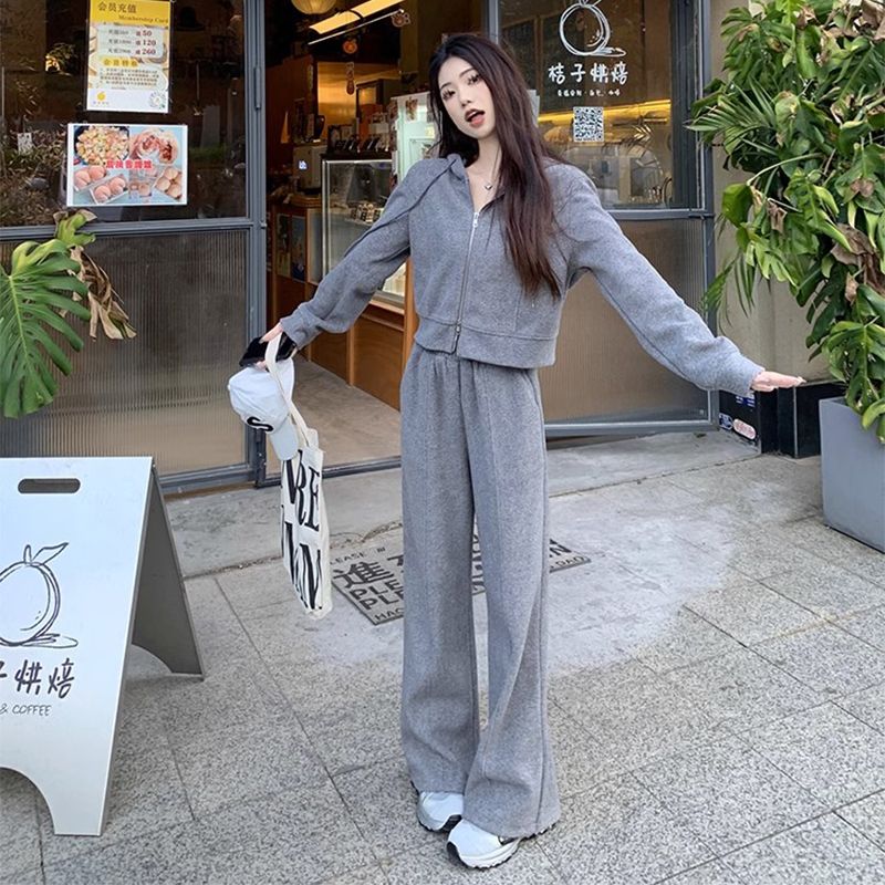 セットアップ ツーピースフード付きジップアップスウェットワイドパンツ女性新作韓国風ルーズカジュアルスポーツセット