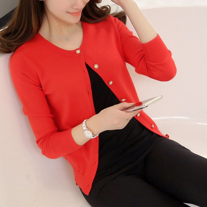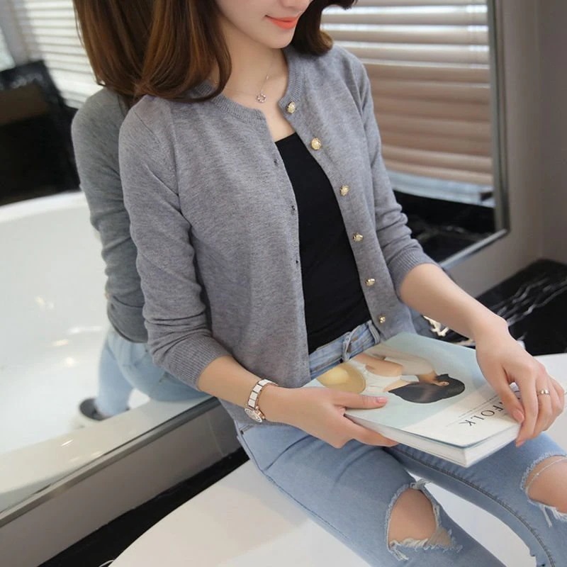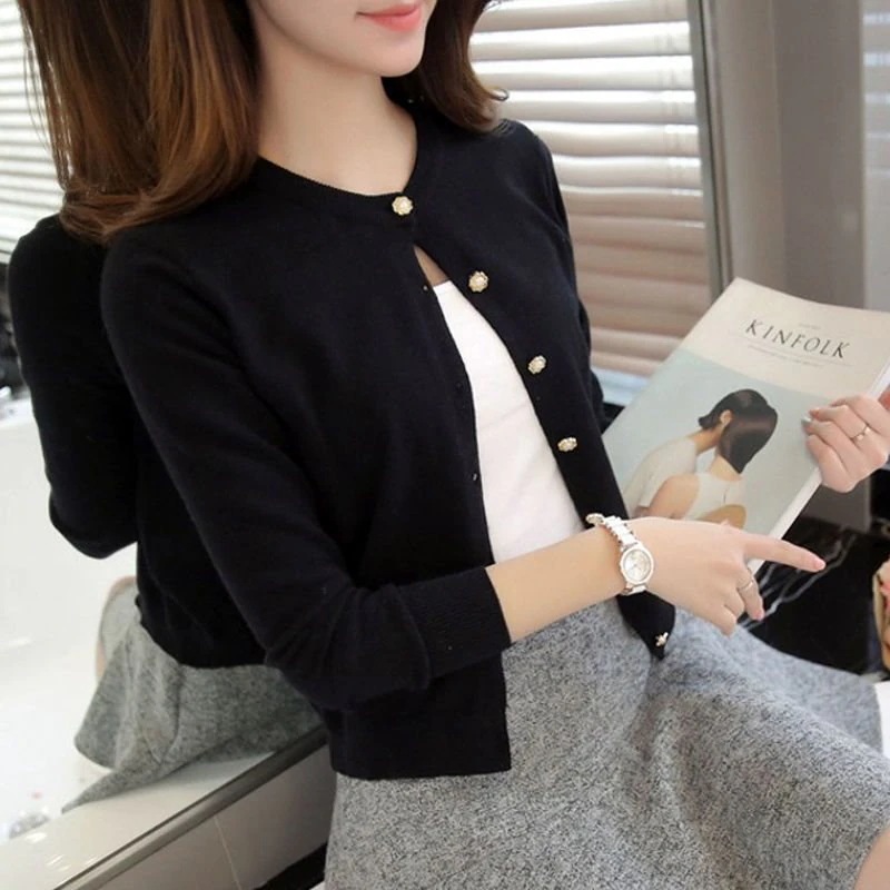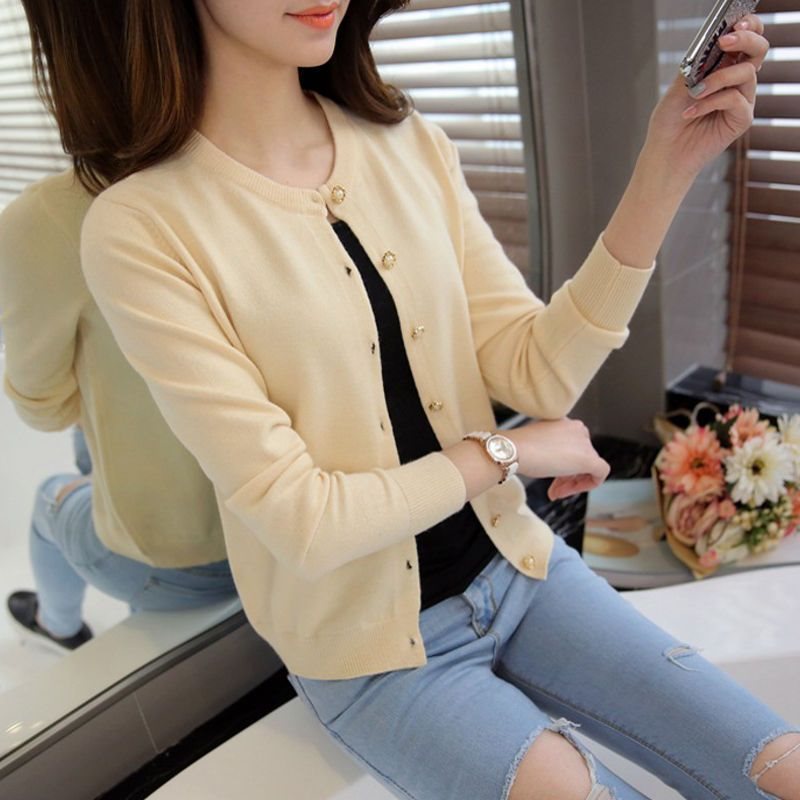 ニットカーディガン女性薄手ラウンドネックスリムフィットショート丈トップス無地セーターアウター