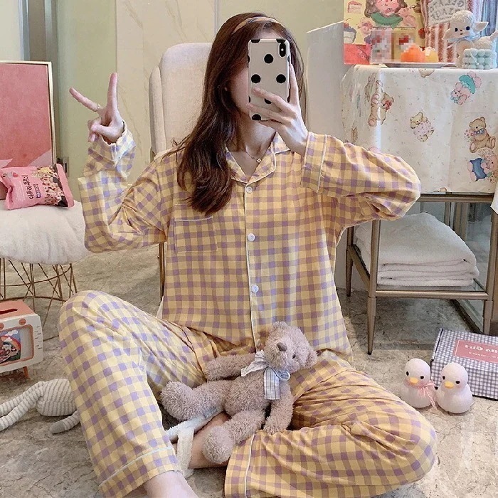 ウェア 春秋 長袖2025 パジャマ 部屋着セット ゆったり ドールネックチェックミルクシルクホームウェア