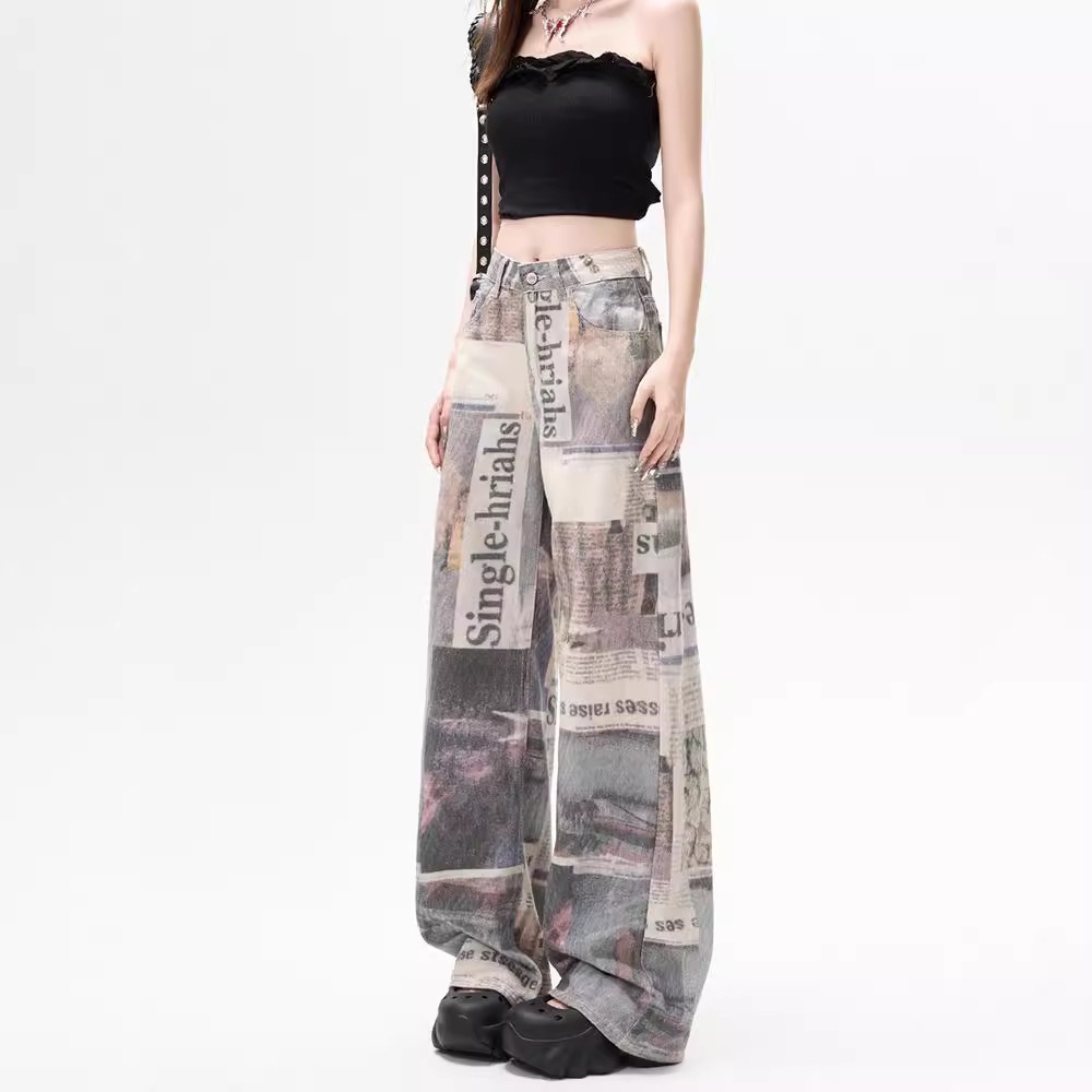 アメリカンヴィンテージ ニュースペーパープリント 女子用ジーンズ 夏用 デザイン感あふれる ハイウエスト ストレート ラフ ロングパンツ