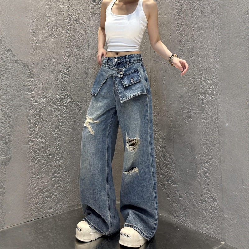 2025 年夏用の大サイズのアメリカンスタイルの広がりズボン 女子用 薄手 ヴィンテージなホールドデザイン ストレート 太った女性向け スリム感出し