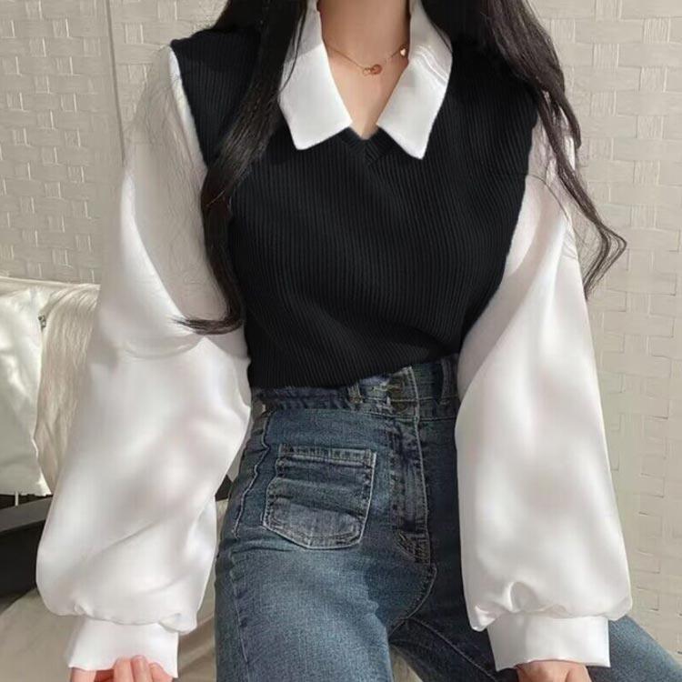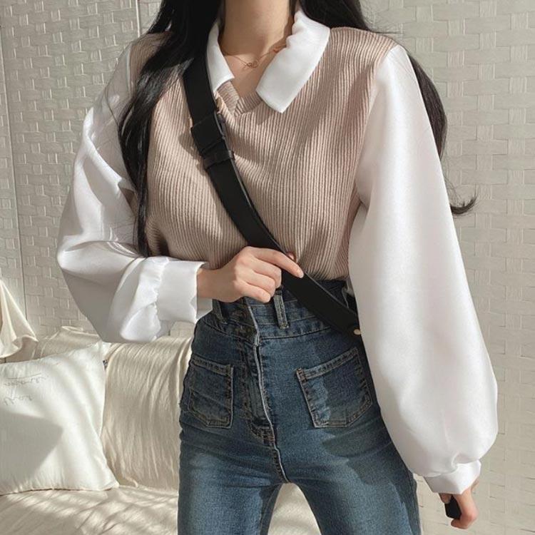 体型カバー チュニック ニット セーター ゆったり ニット 重ね着風 高級な質感 レディース 切り替え レイヤード シャツ カットソー プルオーバー ブラウス