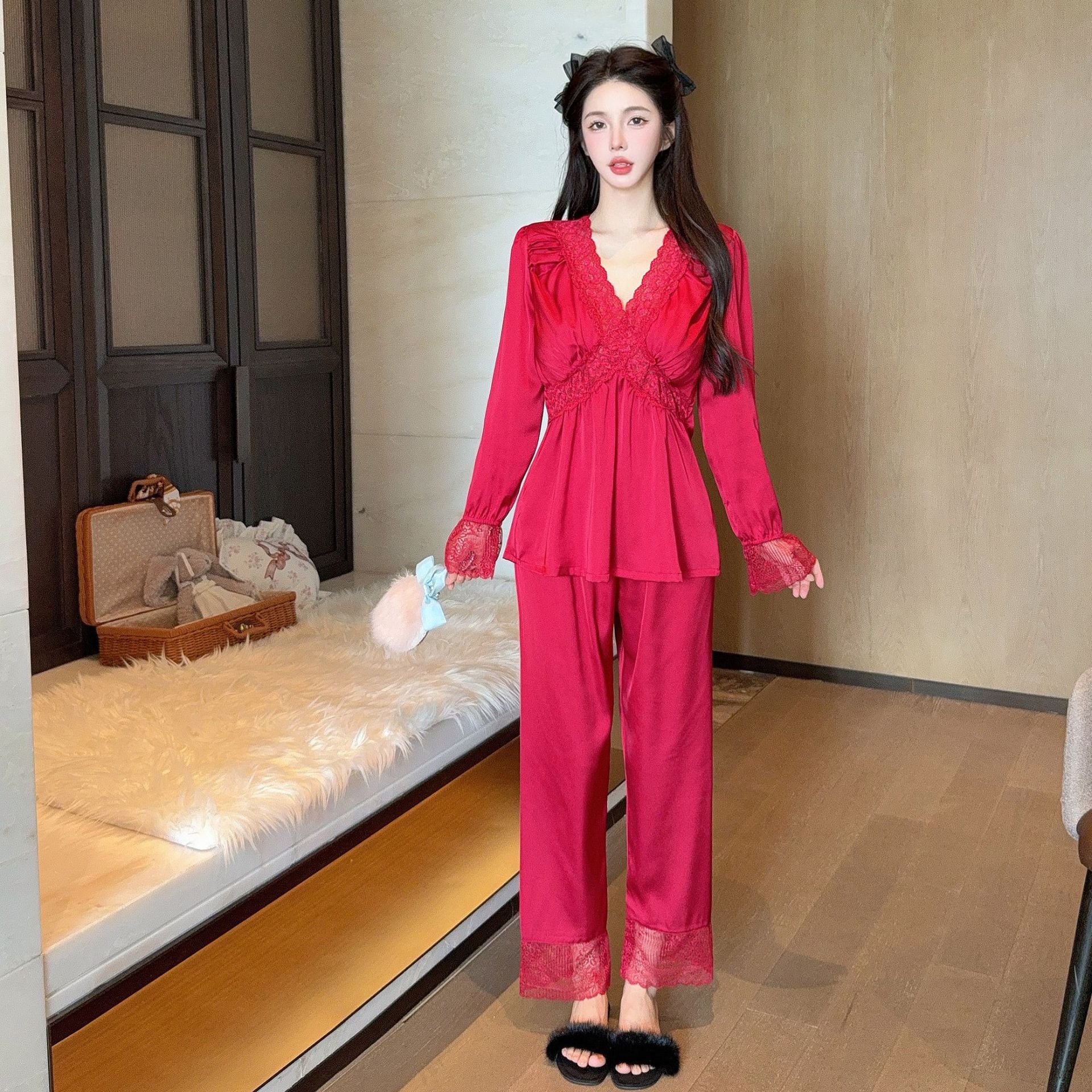 レース付きフレンチ風シルクサテンシフォンホームウェア長袖パジャマ上下セット2点組