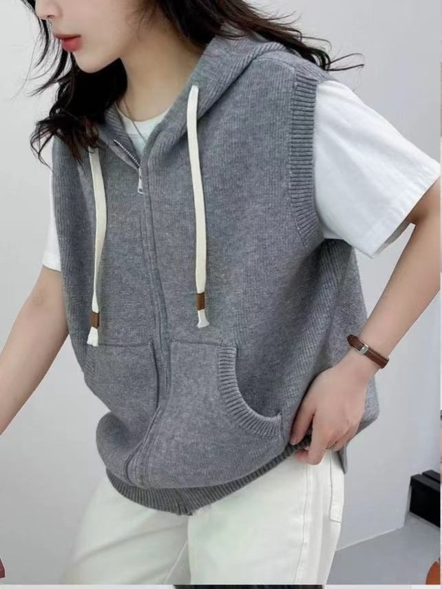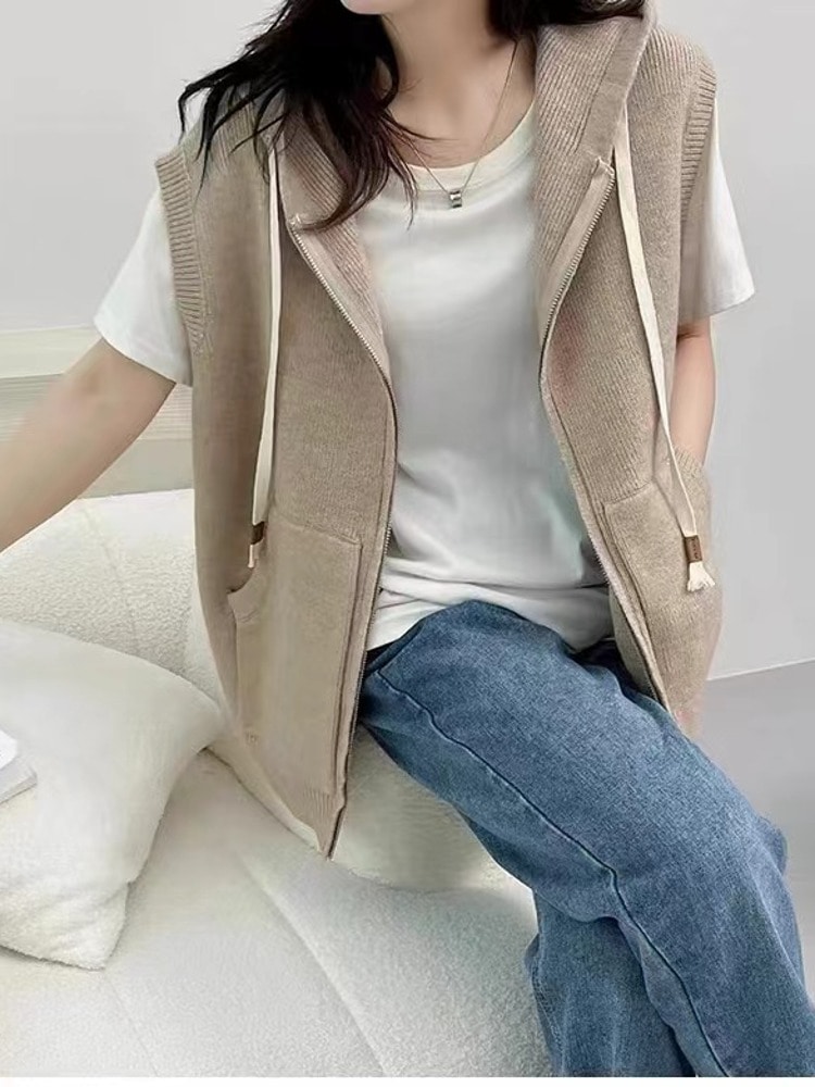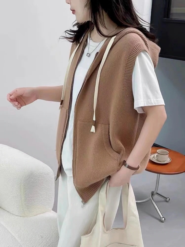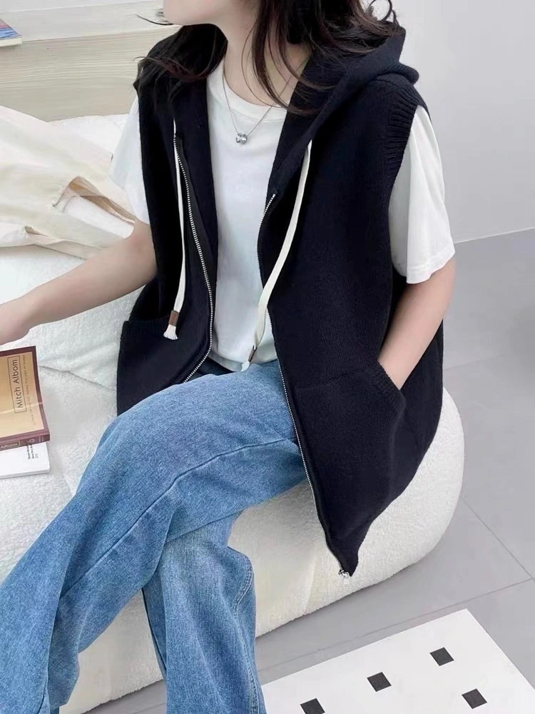 無地 ファッション フード付き 紐付き ニット ベスト 女性用 秋冬 新作 柔らかく肌触りの良い タンクトップ ゆったり カーディガン アウター