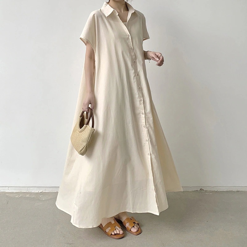 日系夏ワンピース 半袖リネンピュアカラーゆったり開襟カジュアルシャツスカートワンピース