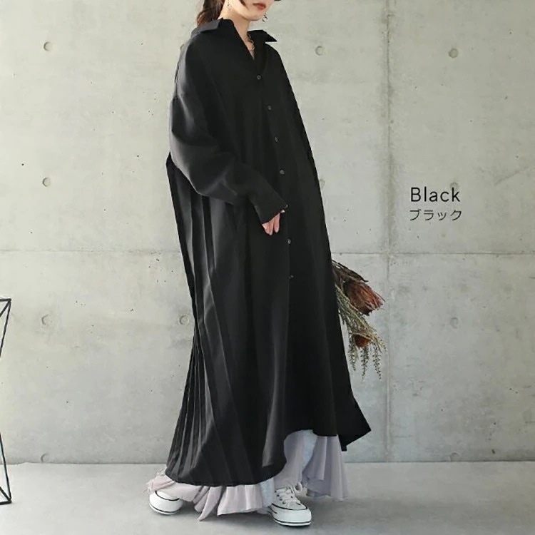 春と秋の新作ゆったり膝丈ワンピースレディース カジュアル大判バックギャザーロング丈シャツスカートワンピース
