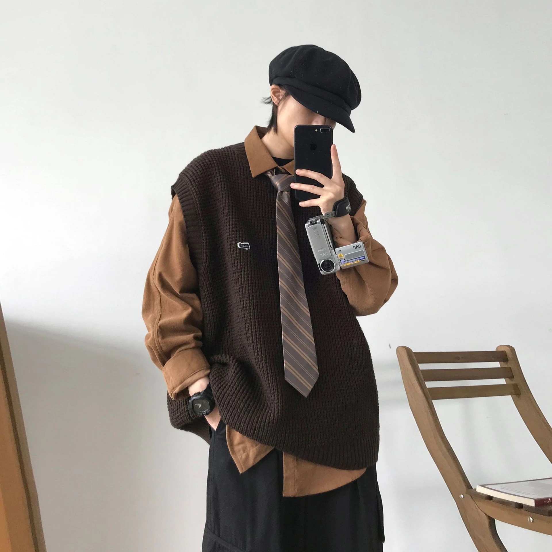 秋冬の日系レトロな丸首ベスト男女学院風ゆったり純色ノースリーブニットベスト