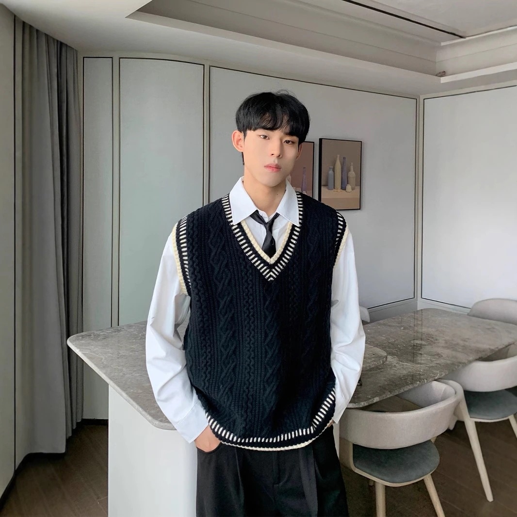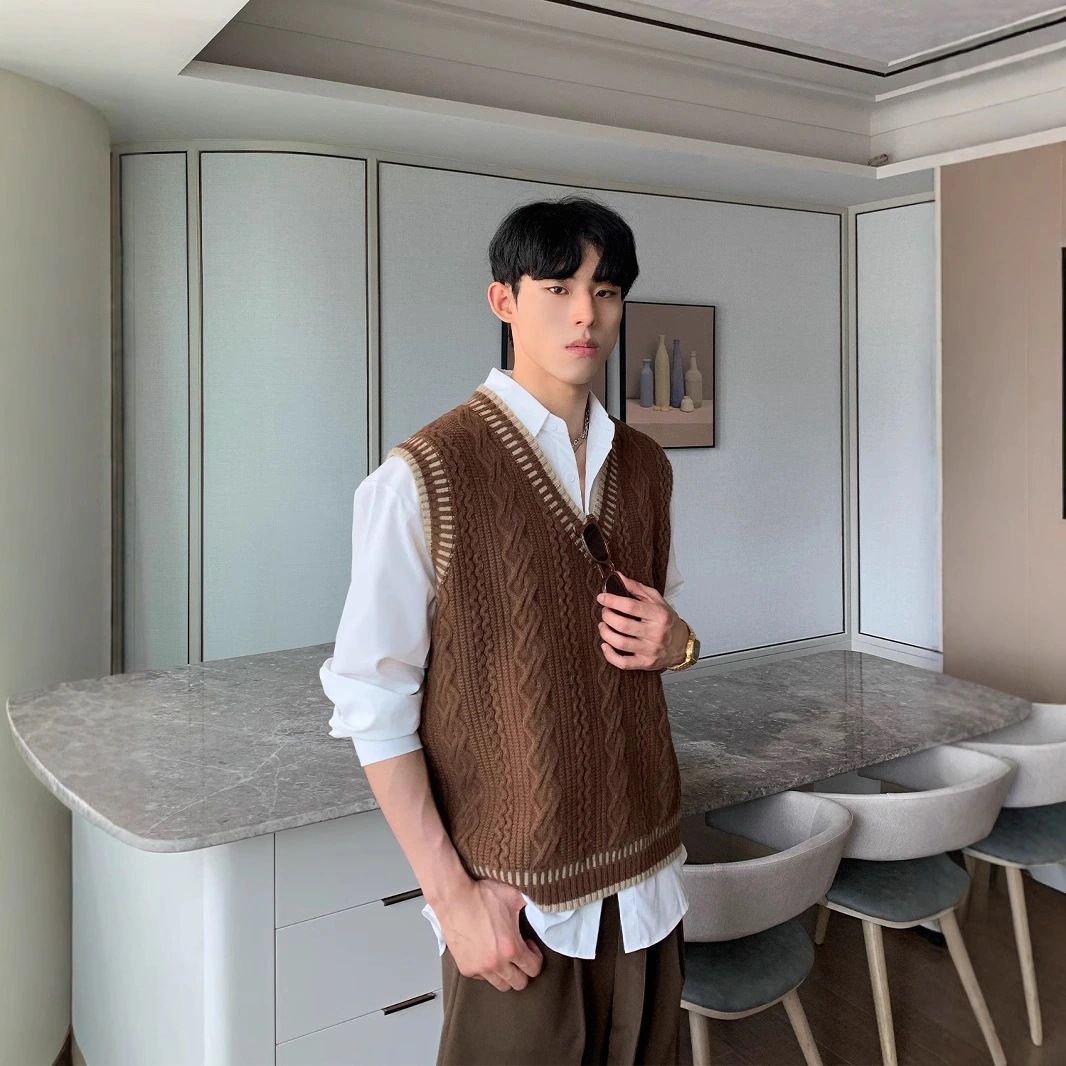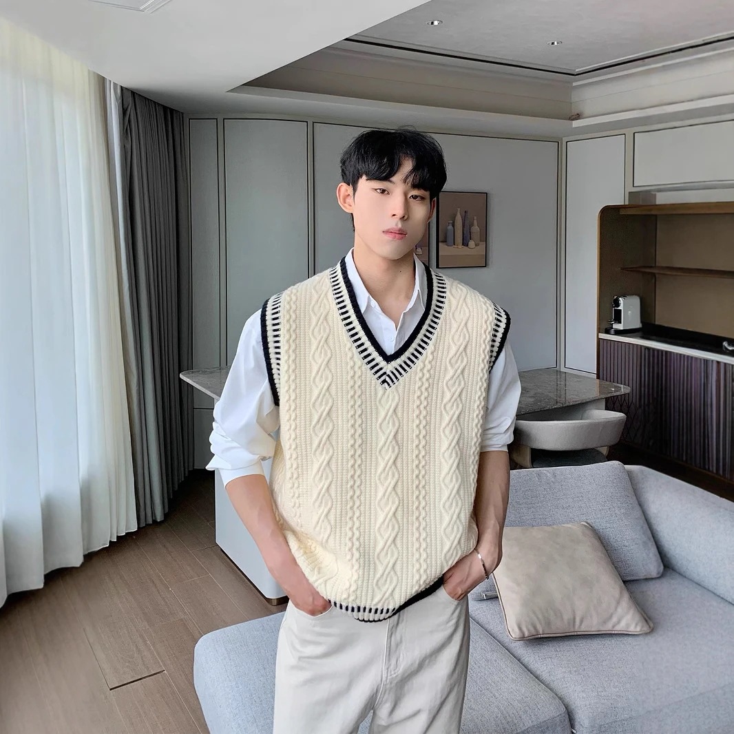 2025秋冬麻花セーターメンズカジュアルVネックタンクトップニット韓国版ゆったりショルダートップス