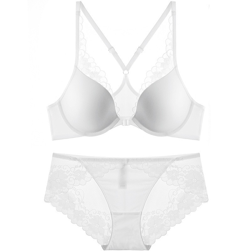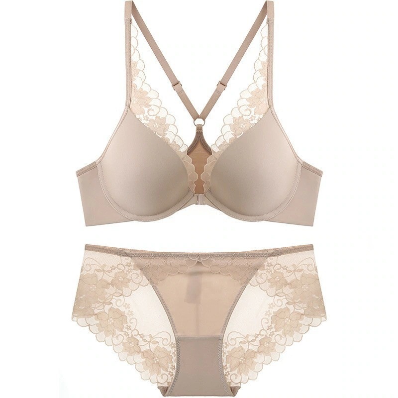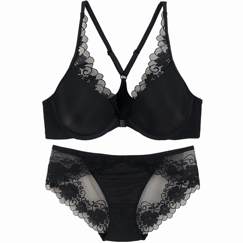 フランスの夏の薄い光沢のレースの下着の前は美背を掛けてブラジャーの大きい胸を集めて小さくてセクシーなブラジャーのスーツを現しますワイヤーレスブラジャーセット