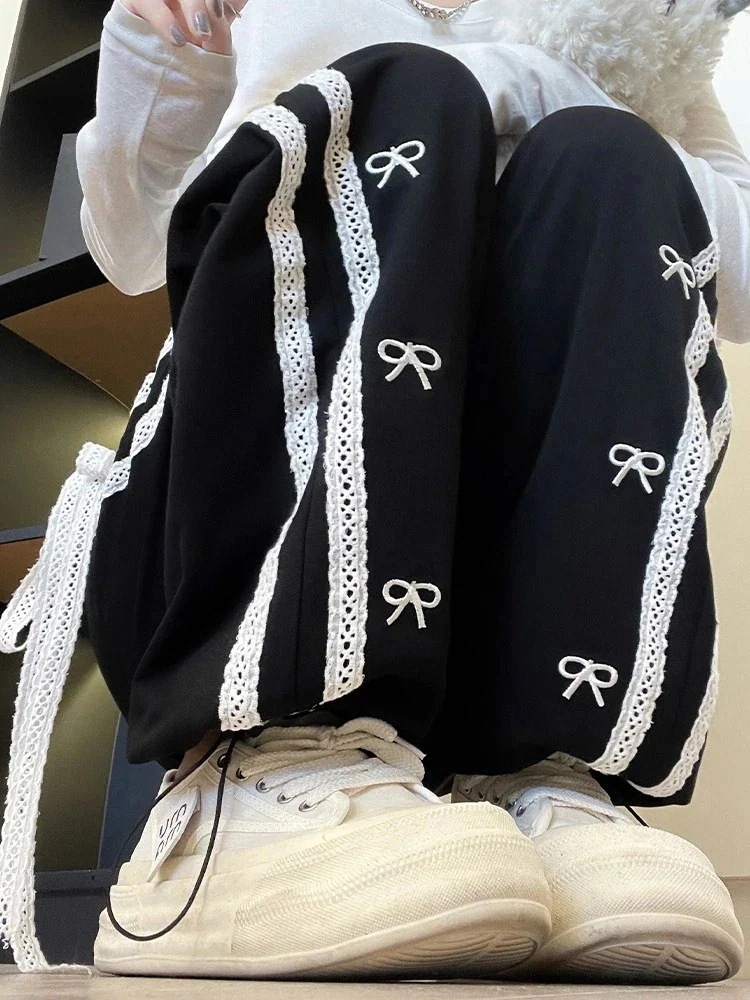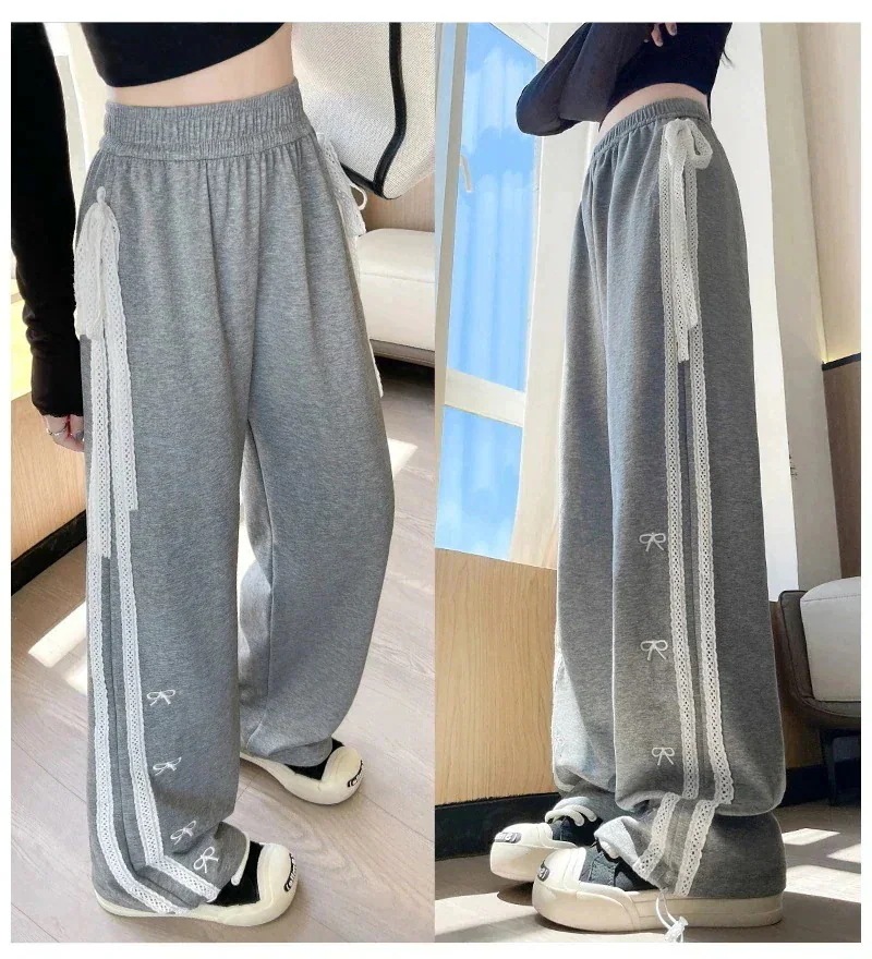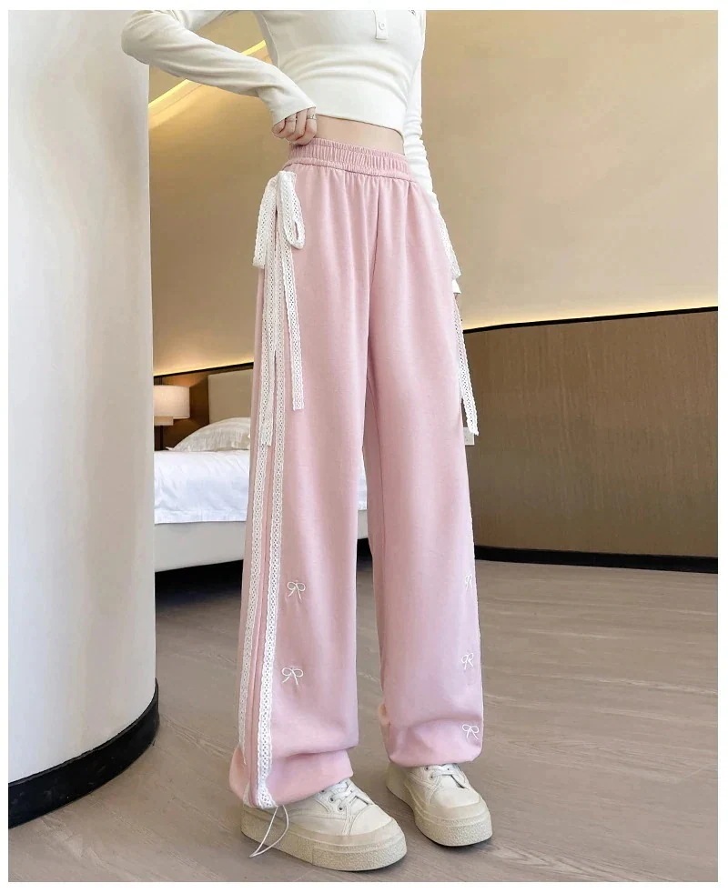 リボン刺繍 + ストライプ柄ドレープドラッグ仕様 ストレートシルエット裾広がり显瘦 ゆとりあり着心地良い通勤・デート・カジュアル着用対応 シワにくい 腰回りフィット