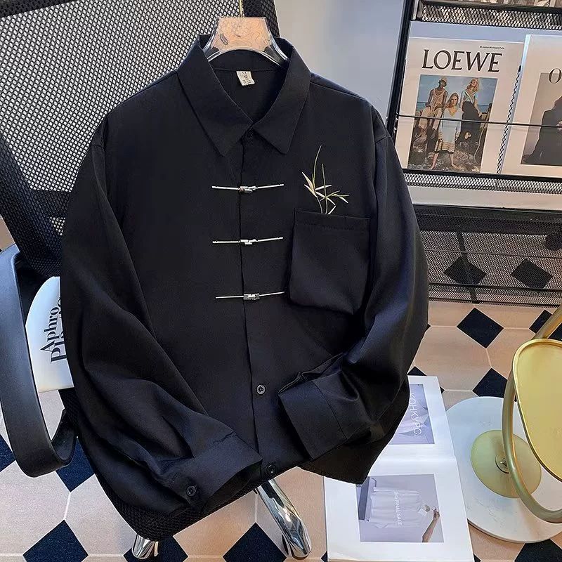 中国風メンズウェア 新中式シャツ 男性向け高級感あるワイルドでクールなトップス 馬面スカートと組み合わせる白のロングスリーブシャツ